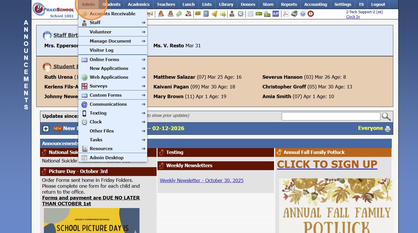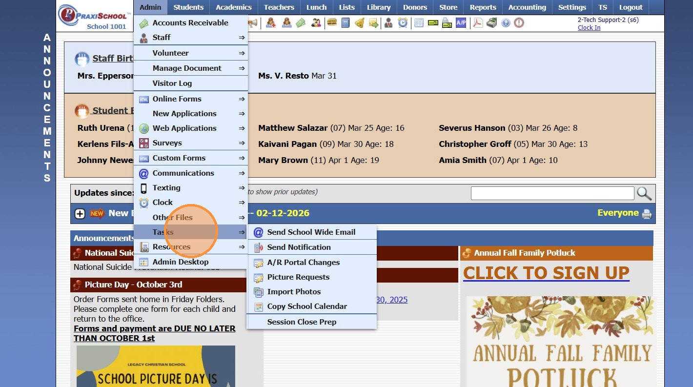 1. Click "Admin" 2. Select "Tasks" 3. Click "Copy School Calendar" 4. Select Current School Year 5. Select New School Year 6. Uncheck Box next to any Calendar Item that should NOT be Copied into the New School Year 7. Update Start Date & End Date for ...
