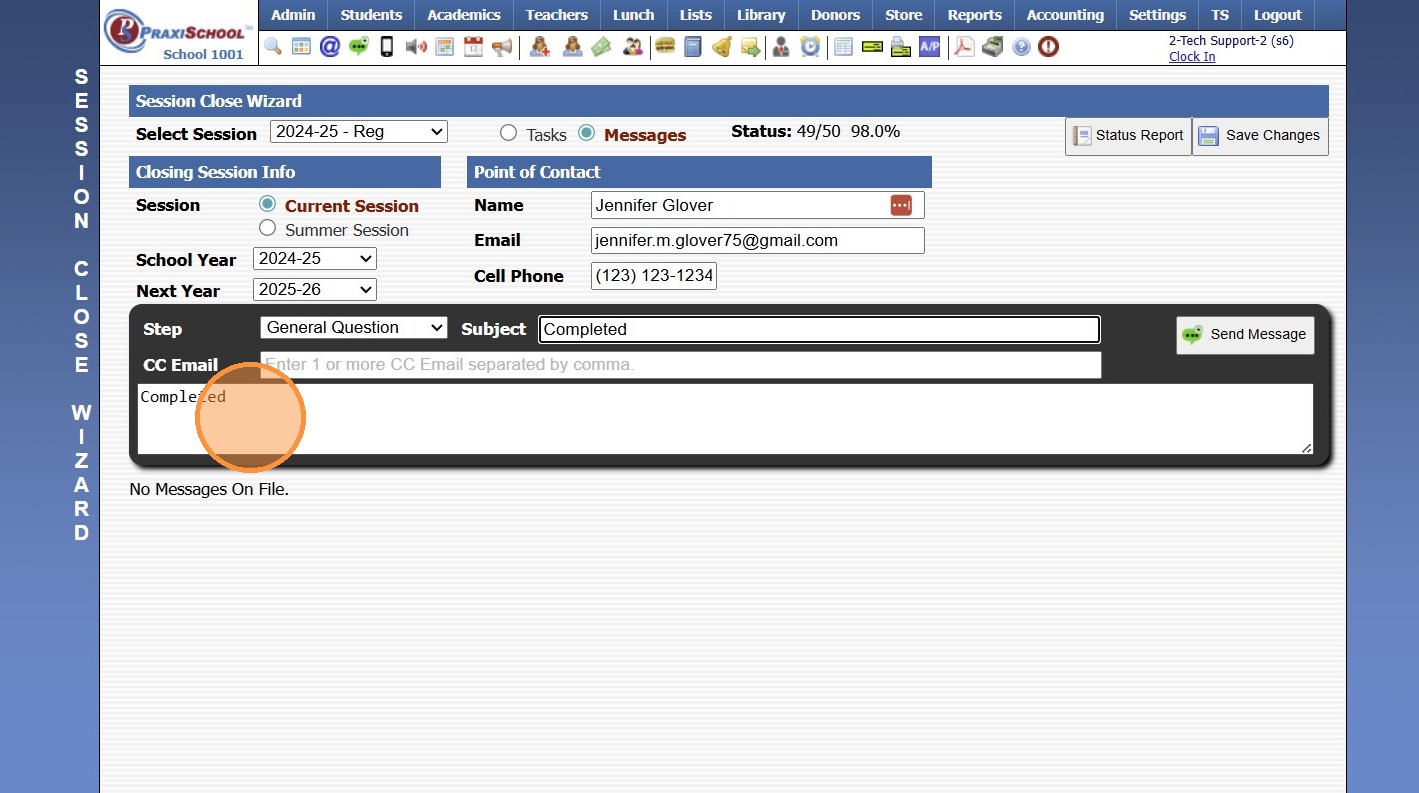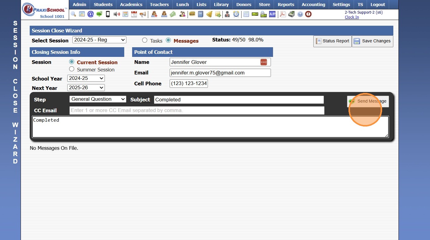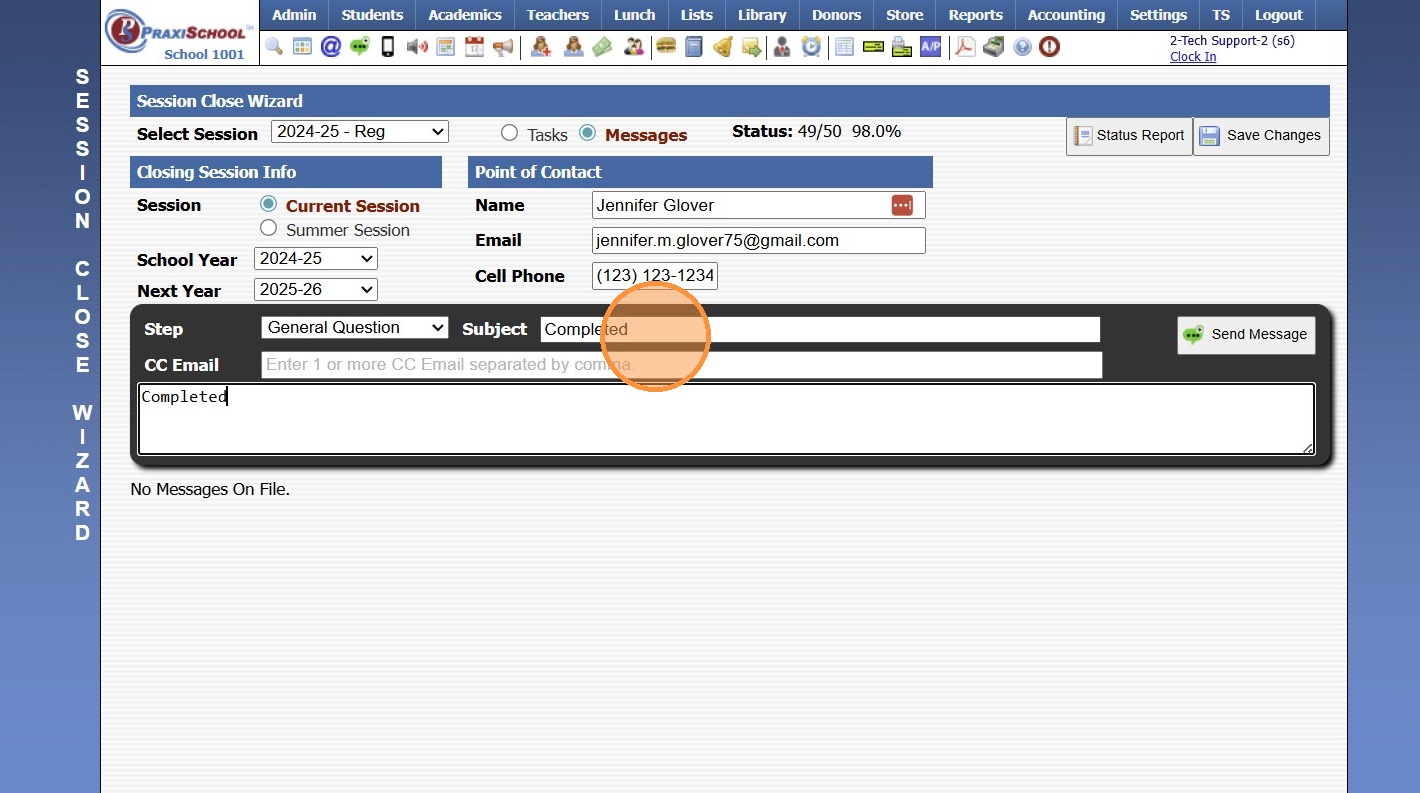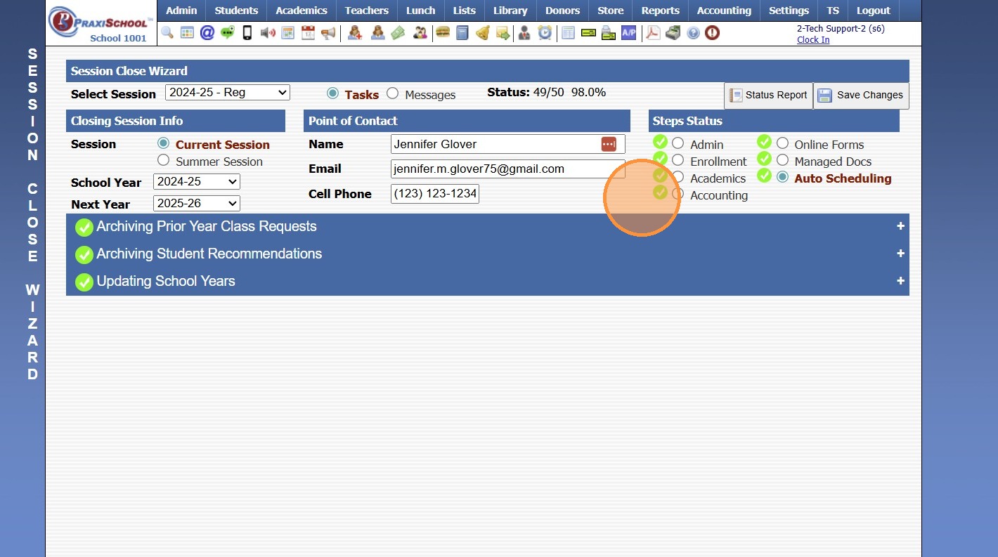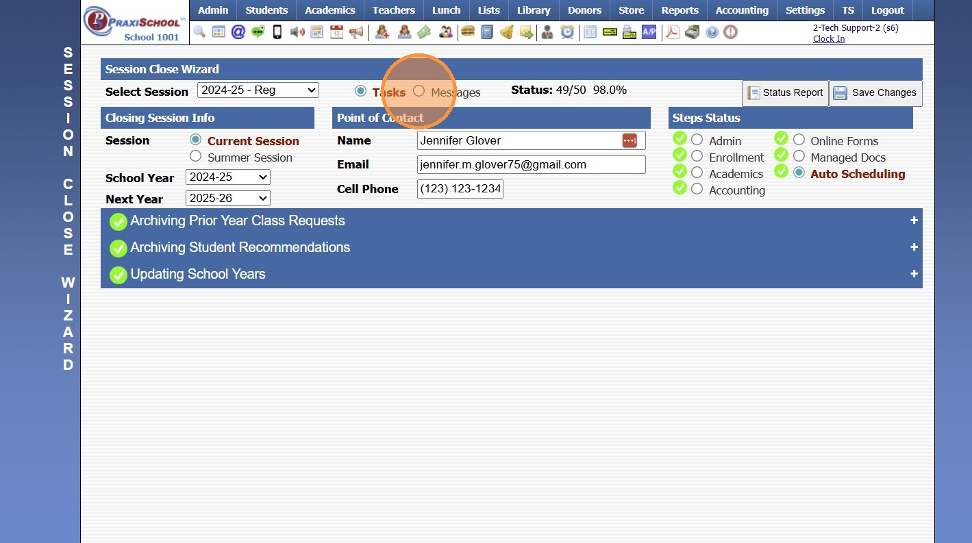 1. Click "Admin" 2. Click "Tasks" 3. Click "Session Close Prep" 4. Select "Create New Closing" from dropdown 5. Select "Current Session" to Close Current School Year, Select "Summer Session" to Close a Summer Session 6. Select Current School Year 7. ...
