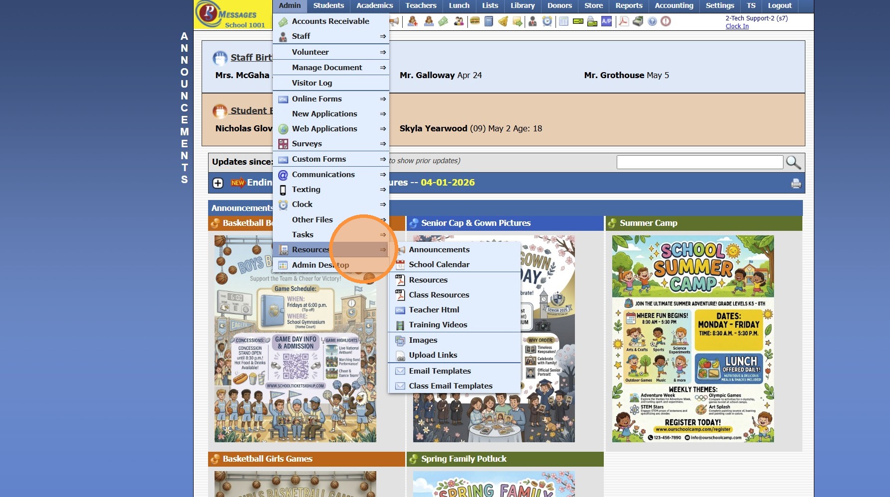 1. Click "Admin" 2. Click "Resources" 3. Click "Announcements" 4. Click "Actions" 5. Click "Make Inactive by Date" 6. Select From & To Dates 7. Click "Save Changes" 814673