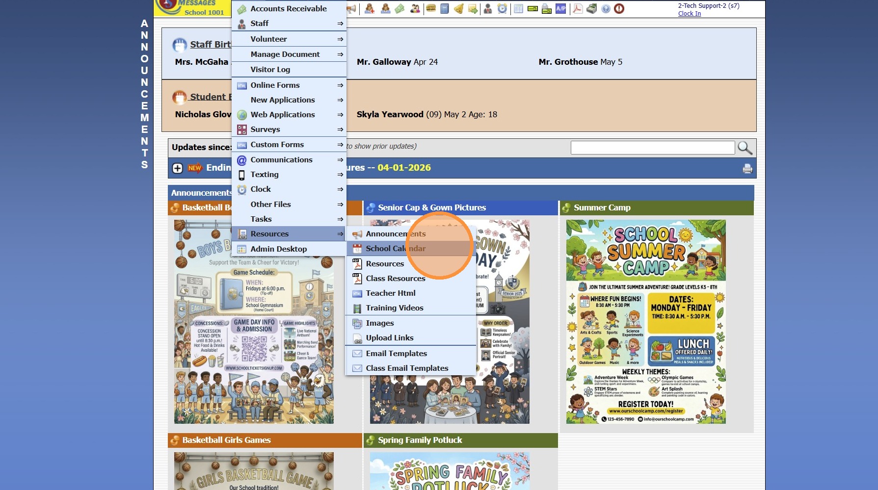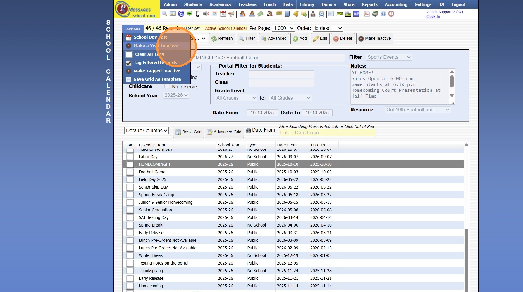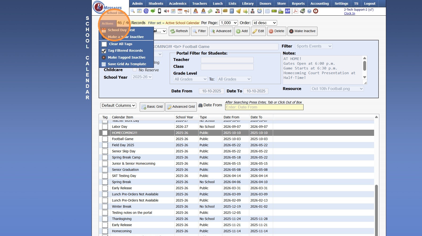 1. Click "Admin" 2. Select "Tasks" 3. Click "Copy School Calendar" 4. Select Current School Year 5. Select New School Year 6. Uncheck Box next to any Calendar Item that should NOT be Copied into the New School Year 7. Update Start Date & End Date for ...