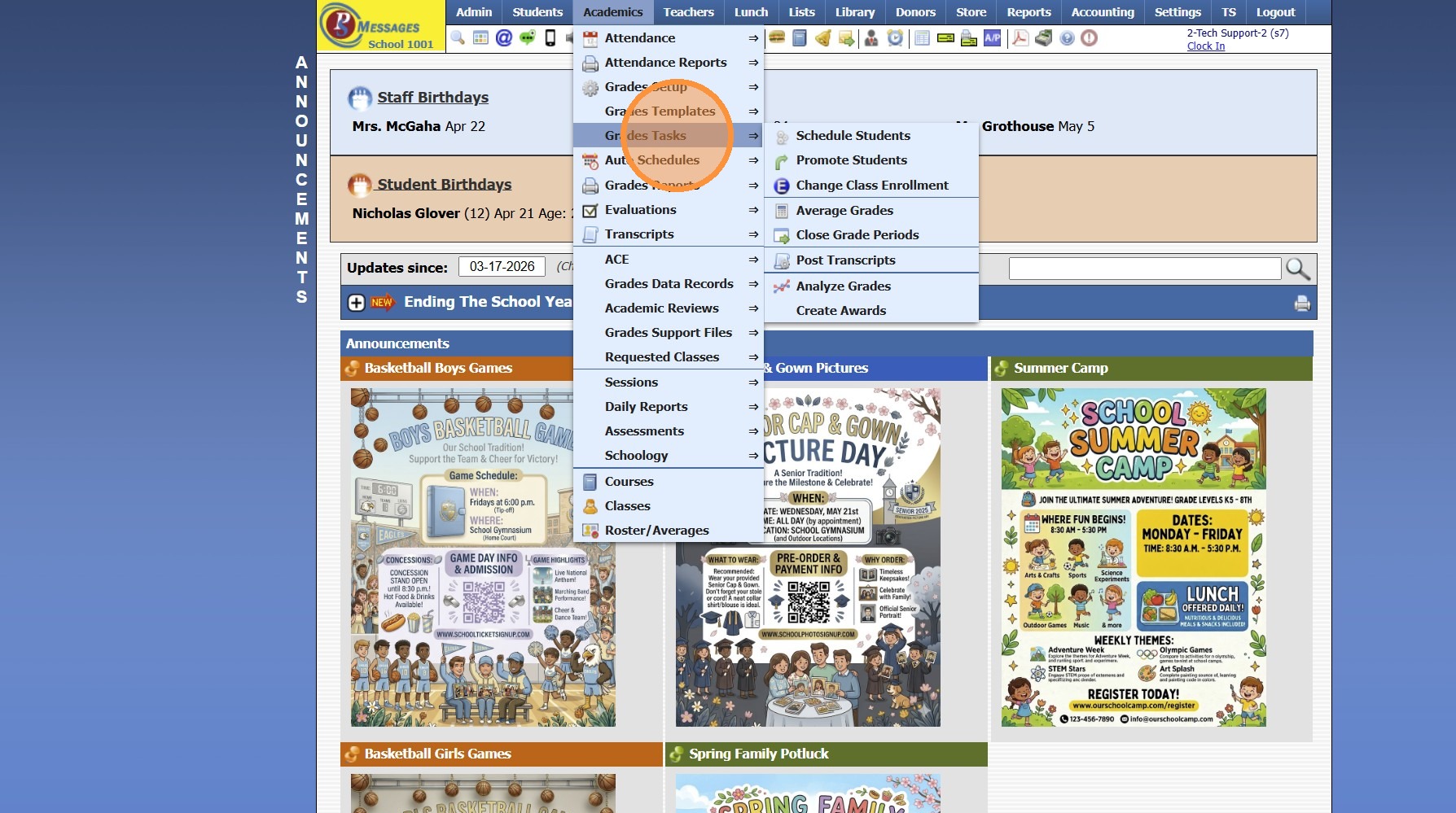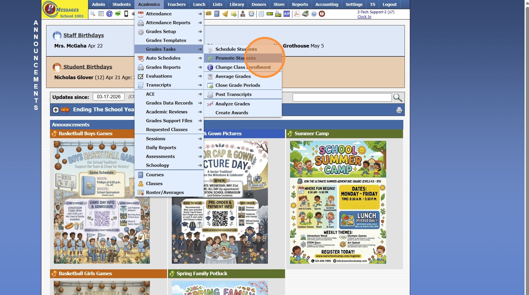 Pre-Register Students to Next Grade Level Using the Promotion Wizard 1. Log into PraxiSchool 2. Click "Academics" 3. Click "Grades Tasks" 4. Click "Promote Students" 5. Set the Effective Date 6. Select Grade Level From and Grade Level To 7. Select ...
