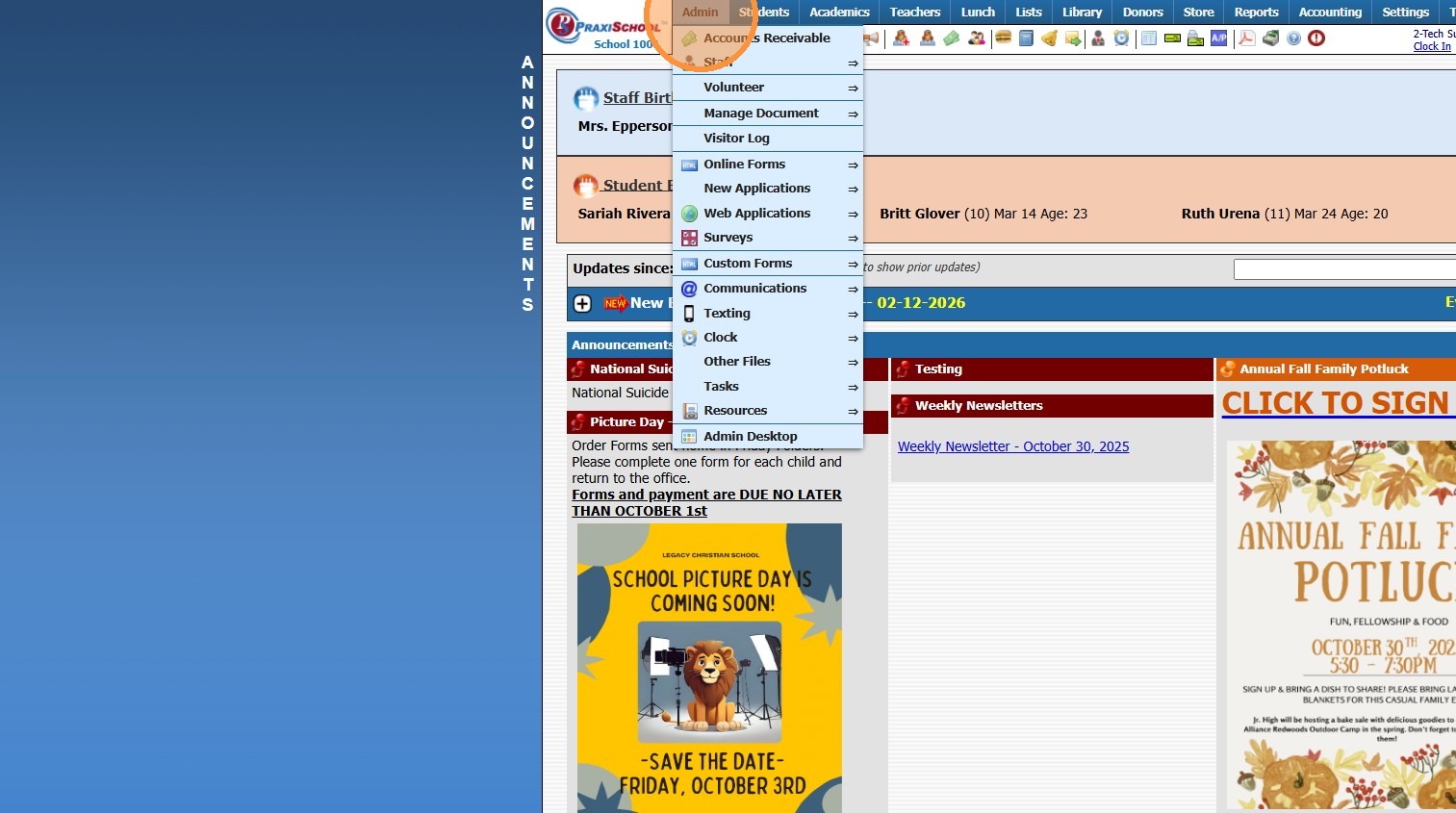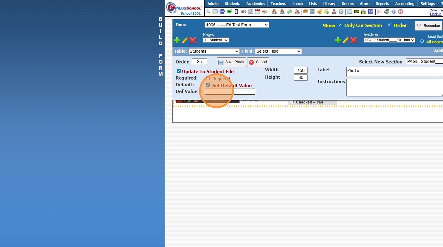 Custom Fields create for Online Forms are for the purpose of Printing the Form Only, Custom Fields do NOT Save to the Student, AR nor Family Files. 1. Click "Admin" 2. Click "Online Forms" 3. Click "Custom Fields" 4. Click "Add" 5. Select or Add a ...
