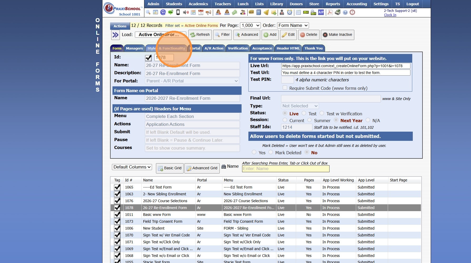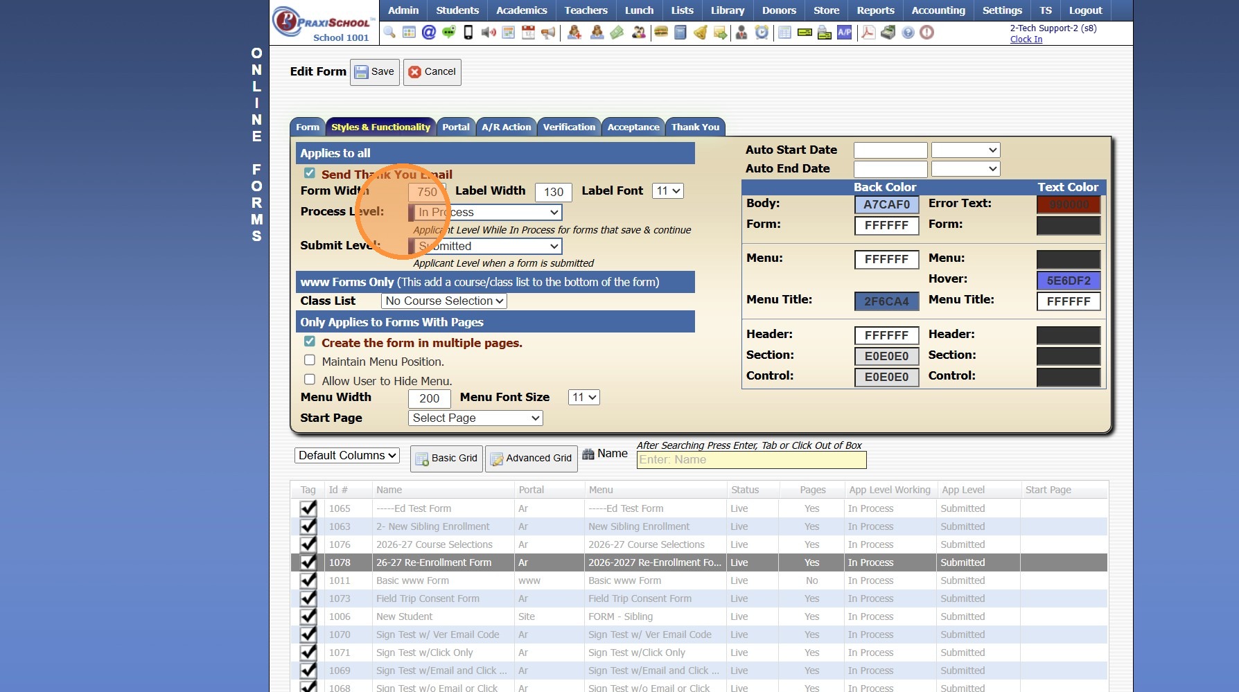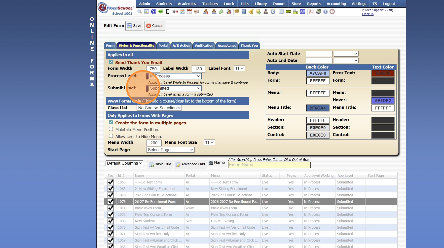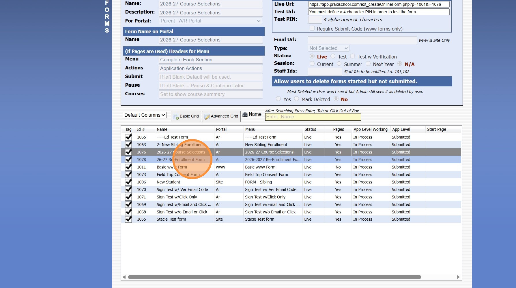 1. Click "Admin" 2. Click "Online Forms" 3. Click "Forms" 4. Click "Add" 5. Add Form Name, Description and Portal Form Name 6. Select the For Portal Option: "Application Site (Only new registration)" 7. Click "Test" to put in Test Mode until Form is ...