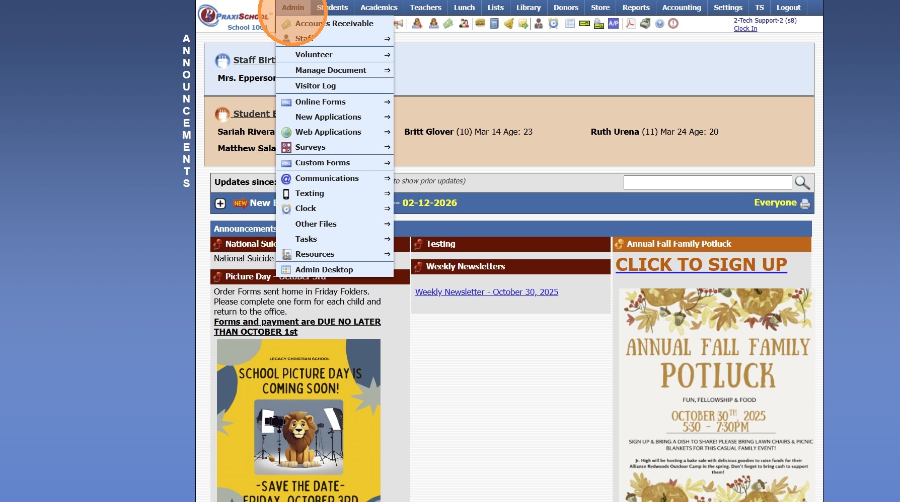 1. Click "Admin" 2. Click "Online Forms" 3. Click "Forms" 4. Click "Add" 5. Add Form Name, Description and Portal Form Name 6. Select the For Portal Option: "Parent - A/R Portal" 7. Click "Test" to put in Test Mode until Form is Built 8. Select ...