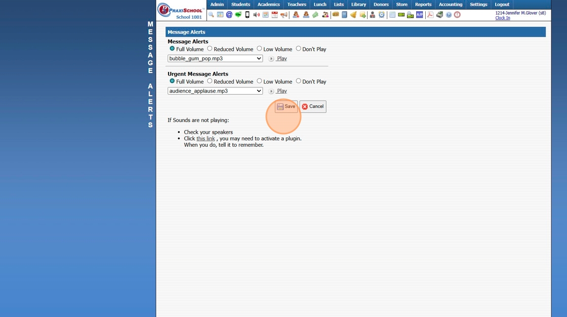 Clock Alerts 1. Log into PraxiSchool 2. Click "Admin" 3. Click "Clock" 4. Click "Clock Alerts" 5. Set Date From and Date To & Click "Refresh" 6. Click "Add" 7. Select Alert For Option: All - All Students, Staff and Family will receive the Alert ...