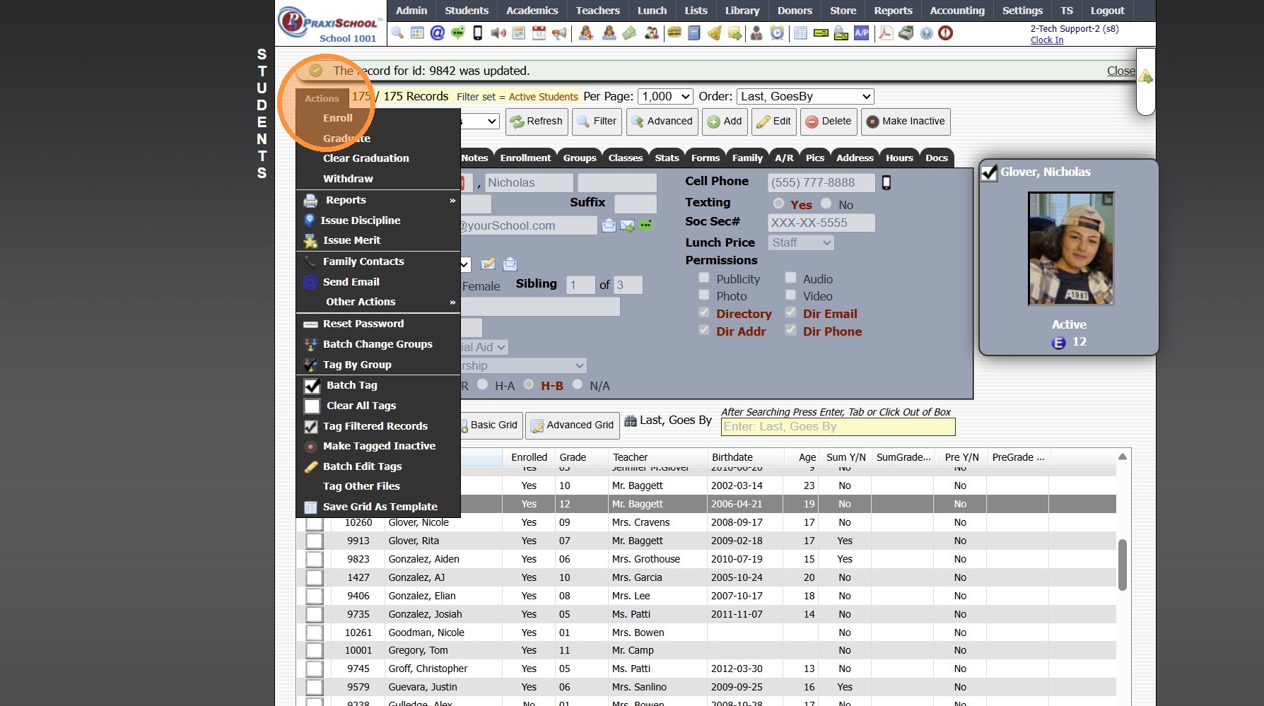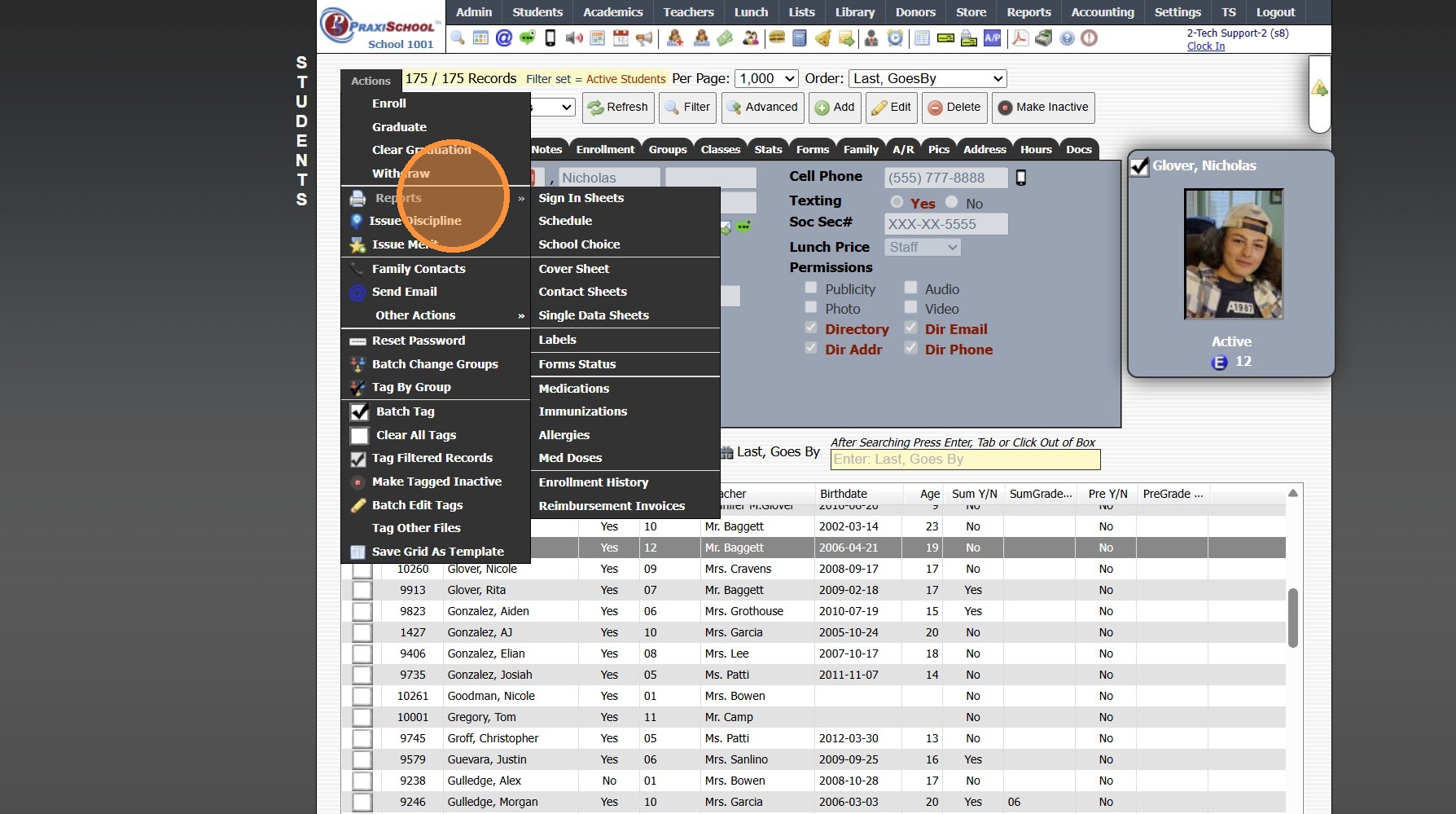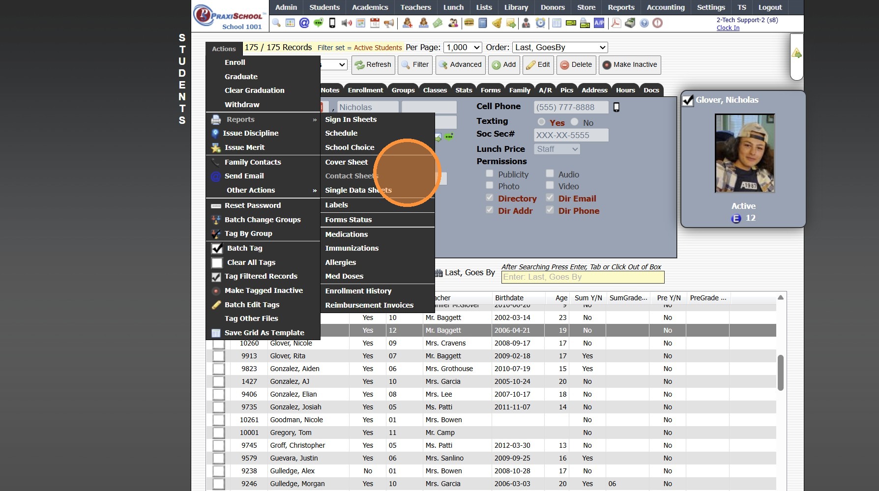 Printing Student Contact Sheets in Batch 1. Log into PraxiSchool 2. Click "Students" 3. Click "Students" 4. Click "Actions" 5. Click "Contact Sheets" 6. Select Print For Option (Single, Active, Tagged, Grade Level, Class OR Homeroom Teacher) 7. ...