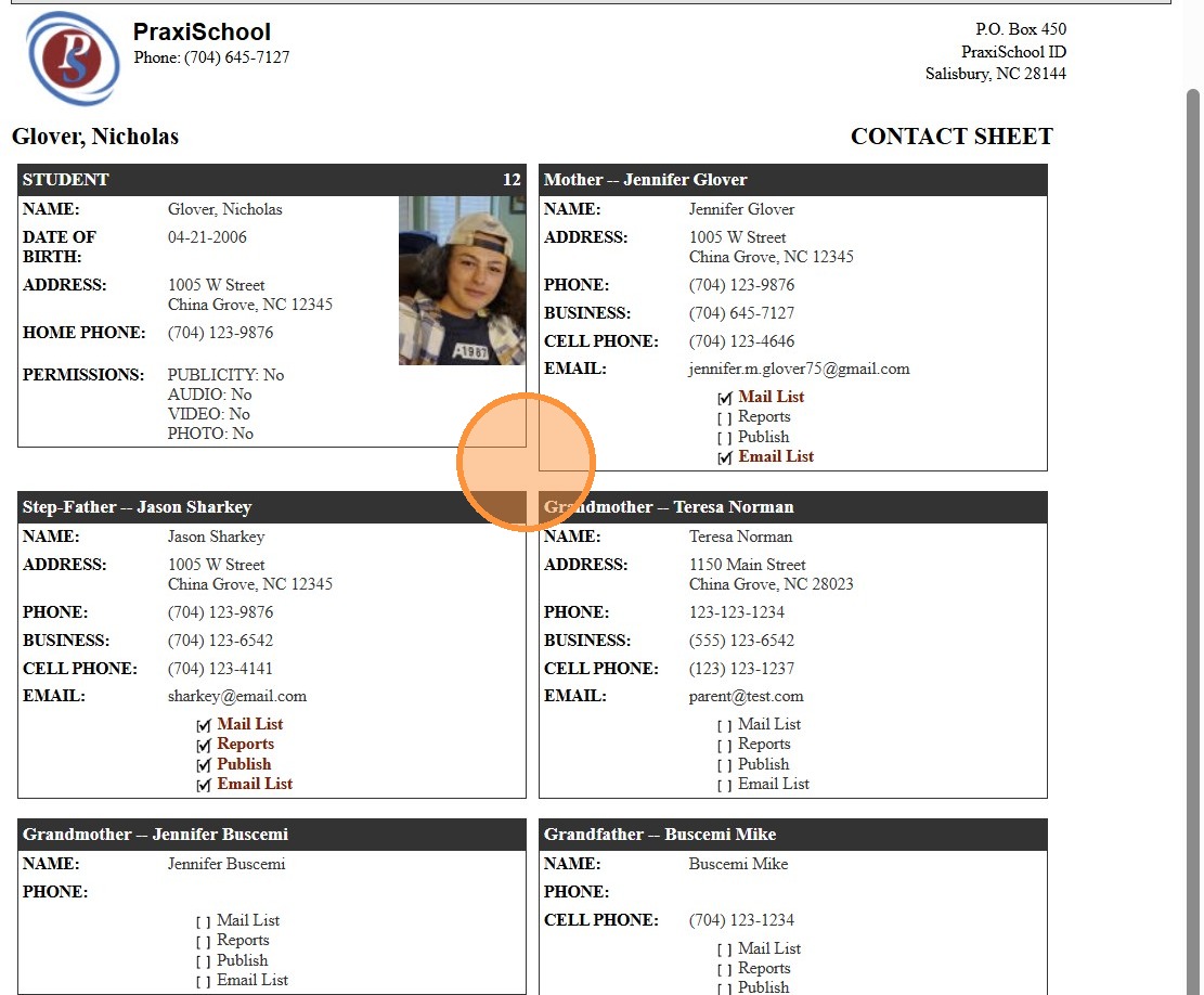 Accessing/Printing Student Family Contact Lists 1. Log into PraxiSchool 2. Click "Students" 3. Click "Students" 4. Select Student 5. Click "Actions" 6. Click "Family Contacts" 7. Student Contact Sheet Options: Print, Email or Download to a PDF ...