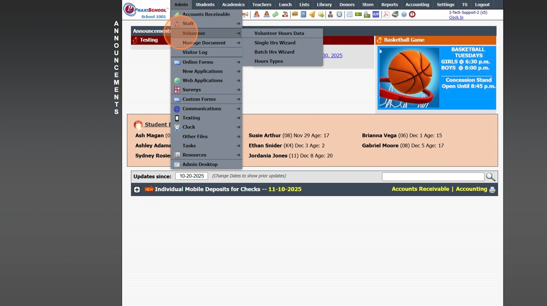 Single Hrs Wizard: Adding Volunteer Hours Individually by A/R Account or Student 1. Click "Admin" 2. Click "Volunteer" 3. Click "Single Hrs Wizard" 4. Select Table "A/R" or "Student" 5. Search Parent / Student Name 6. Click "Add" 7. Set Date & Select ...