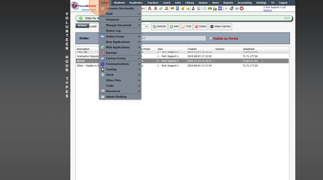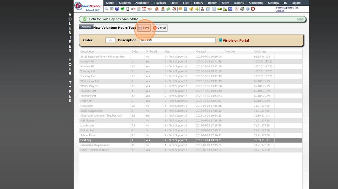 Volunteer Hours Type: Setting Up Volunteer Hours 1. Click "Admin" 2. Click "Volunteer" 3. Click "Hours Types" 4. Click "Add" 5. Enter Volunteer Hour Description 6. Enter Order Number (Optional) (If Order Number is not entered, items will appear in ...