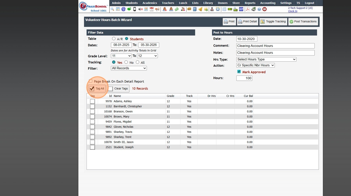 Batch Hrs Wizard: Batch Adding Required Volunteer Hours 1. Click "Admin" 2. Click "Volunteer" 3. Click "Batch Hrs Wizard" 4. Click "Tag All" 5. Untag Accounts that should not have Volunteer Hour Requirements Added 6. Filter "Tagged Records" 7. Set ...