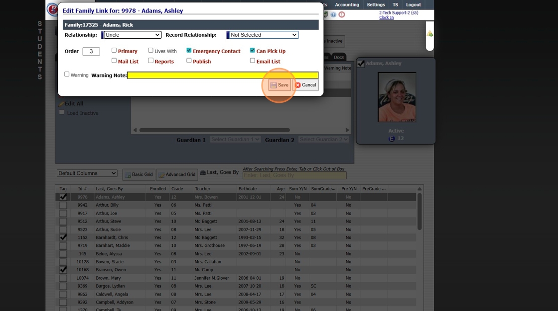 Students: Adding Existing Family Member to Family Connections 1. Click "Students" 2. Click "Students" 3. Select Student 4. Click "Family" tab 5. Click "Add" 6. Search Family Member & Select 7. Click "OK" 8. Select the Relationship to Student 9. ...