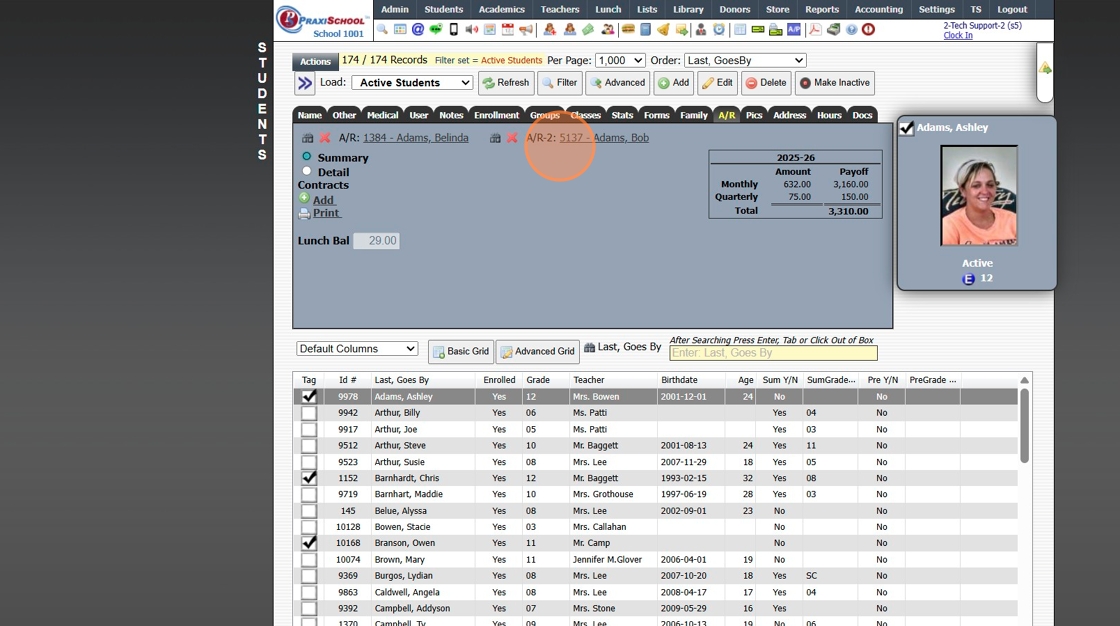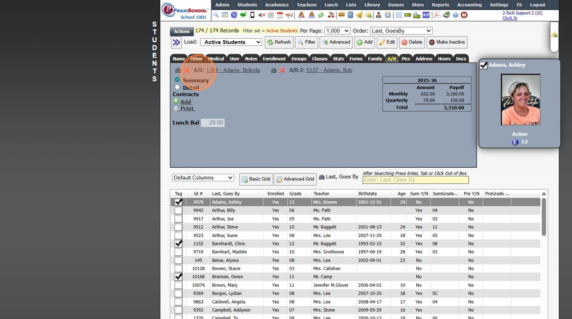 Students: Viewing Billing Contracts 1. Click "Students" 2. Click "Students" 3. Select Student 4. Click "A/R" tab 5. Summary - Default View View Contract Amounts by Billing Frequency 6. Detail View View Contract Details (Comment, General Ledger ...