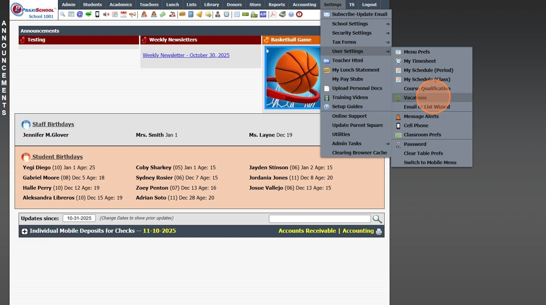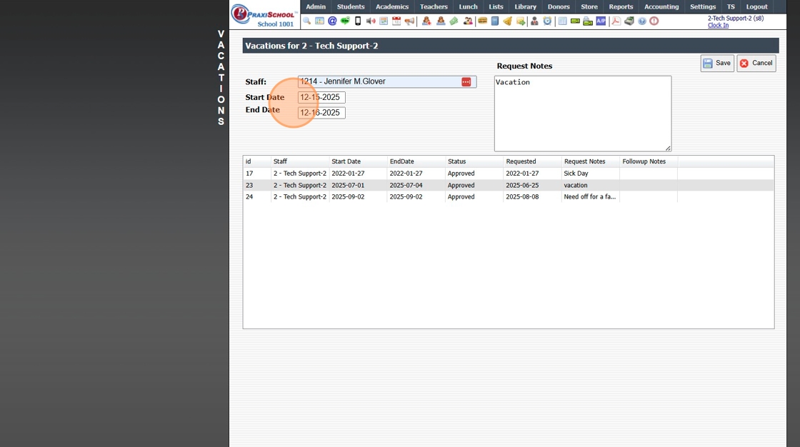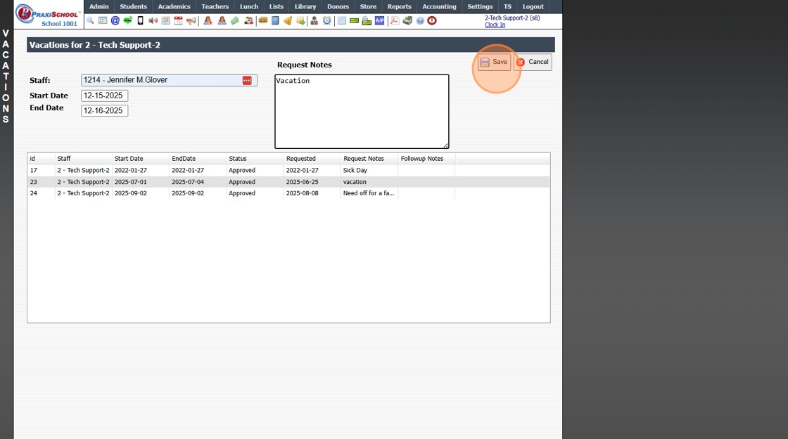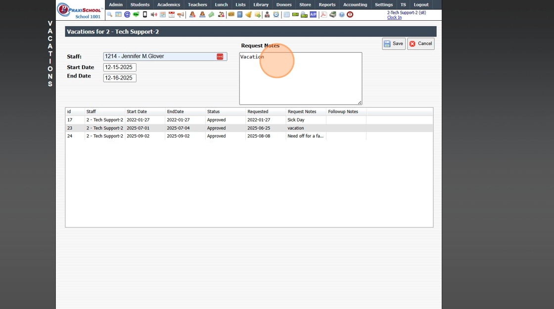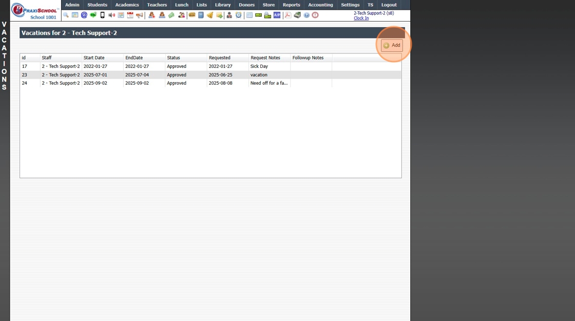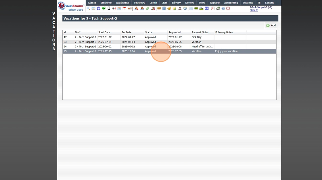 Viewing, Approving or Denying Staff Time Off Requests 1. Click "Admin" 2. Click "Staff" 3. Click "Vacations" 4. Select Time Off Request 5. Click "Edit" 6. Select "Approved / Denied" 7. Enter Number of Requested Hours / Days (Optional) 8. Enter Follow ...