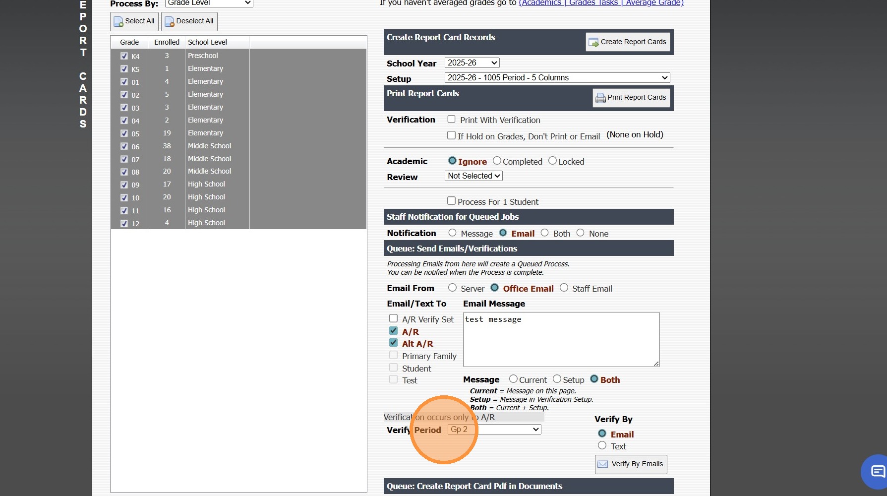 1. Click "Academics" 2. Click "Grades Reports" 3. Click "Print Report Cards" 4. Click "Select All" or select by Grade / Homeroom Teacher 5. Select Email From Option 6. Select Email To Option(s) 7. Add Message (Optional) 8. Select Verify Period ...