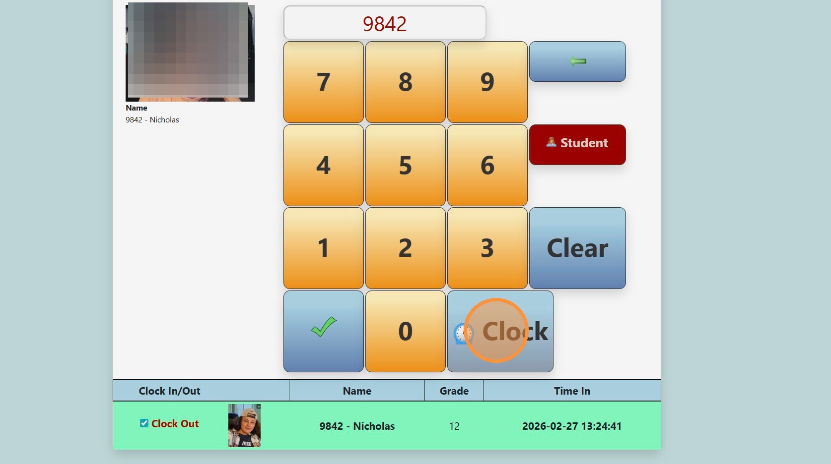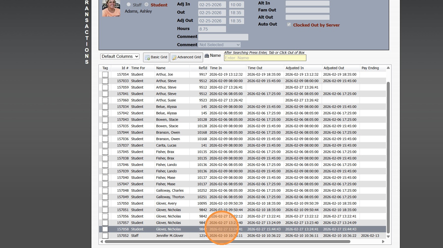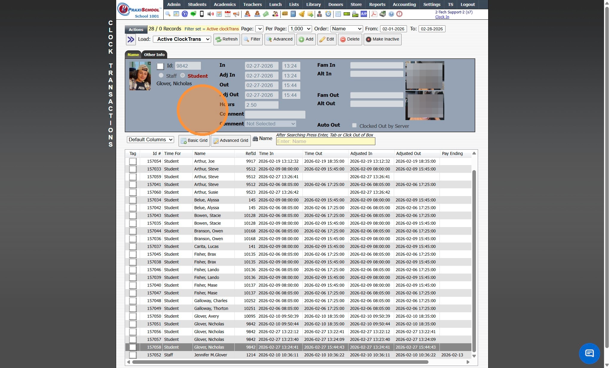 Tip: If using the Webcam to Save Picture of Person Clocking Student In/Out, the Picture will be Saved in Clock Transactions. See Below: