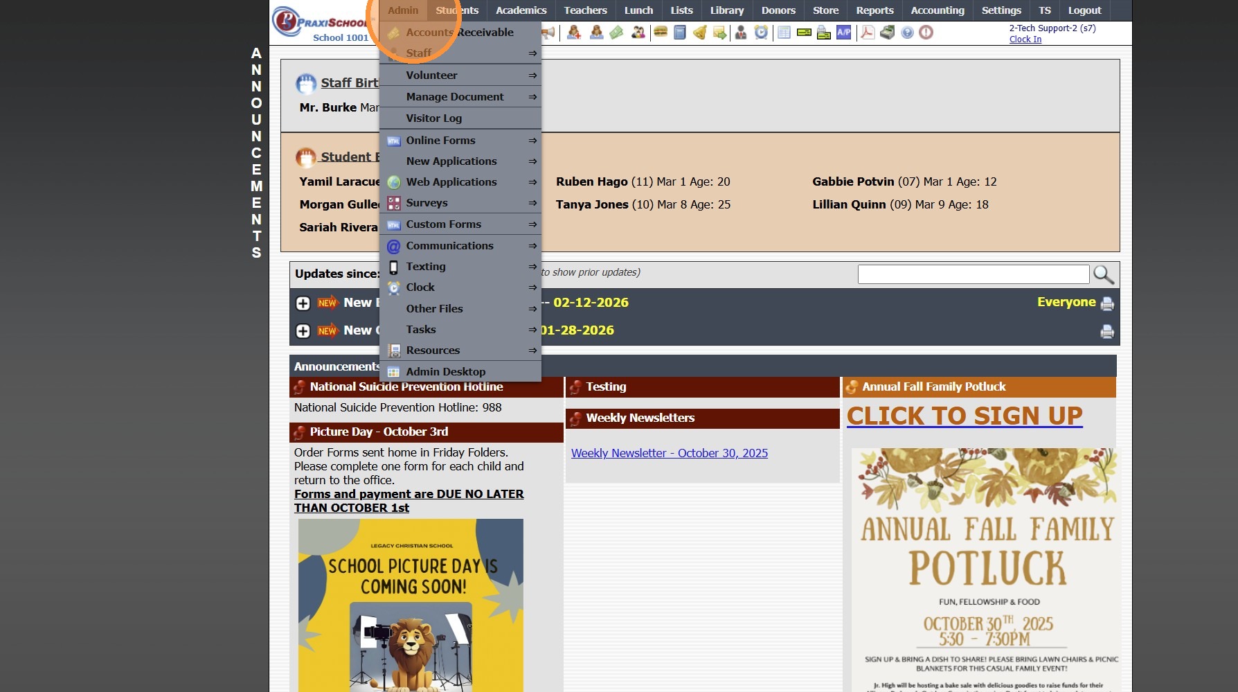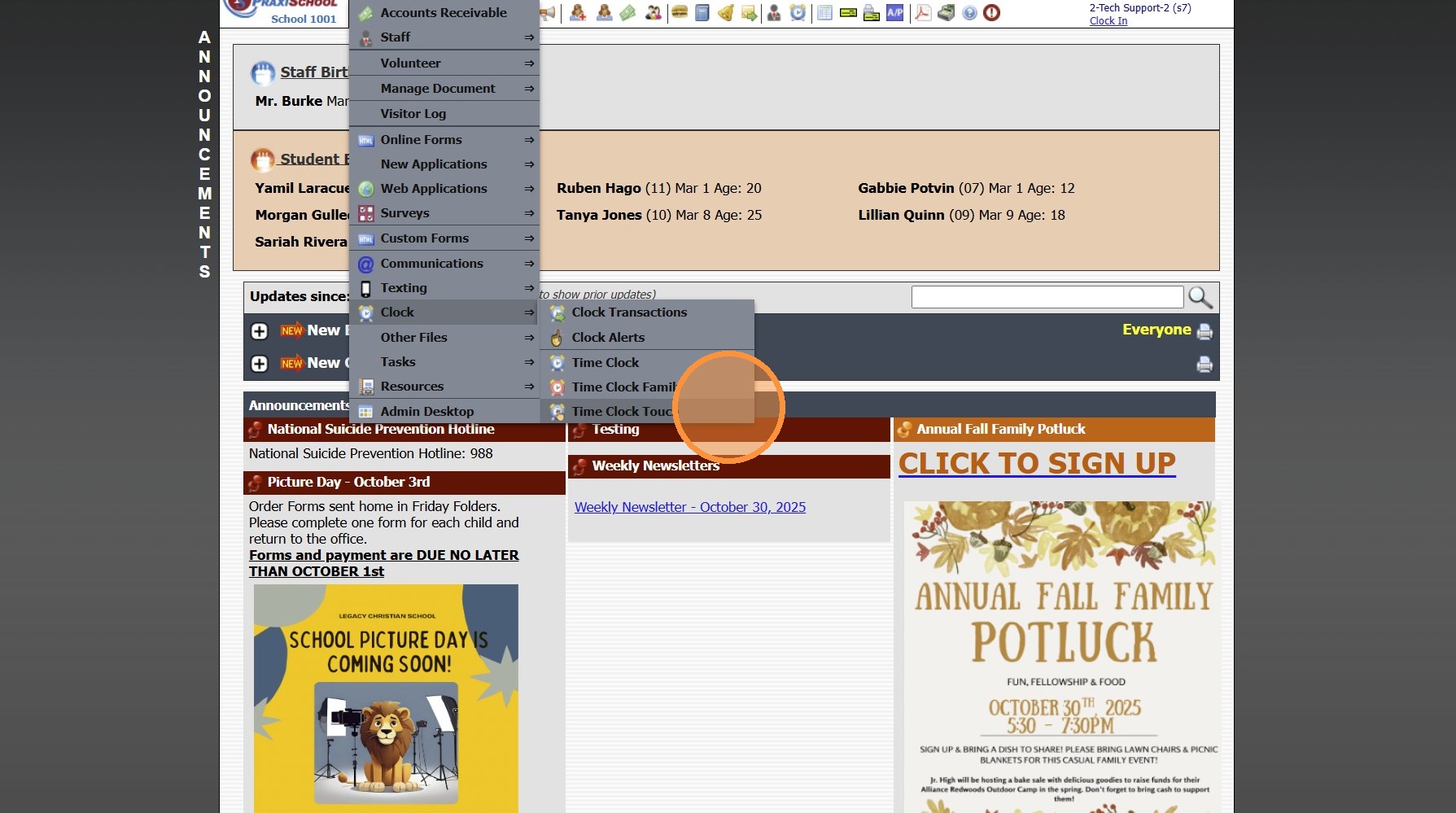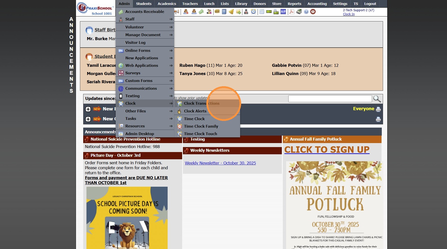 Clock Alerts 1. Log into PraxiSchool 2. Click "Admin" 3. Click "Clock" 4. Click "Clock Alerts" 5. Set Date From and Date To & Click "Refresh" 6. Click "Add" 7. Select Alert For Option: All - All Students, Staff and Family will receive the Alert ...