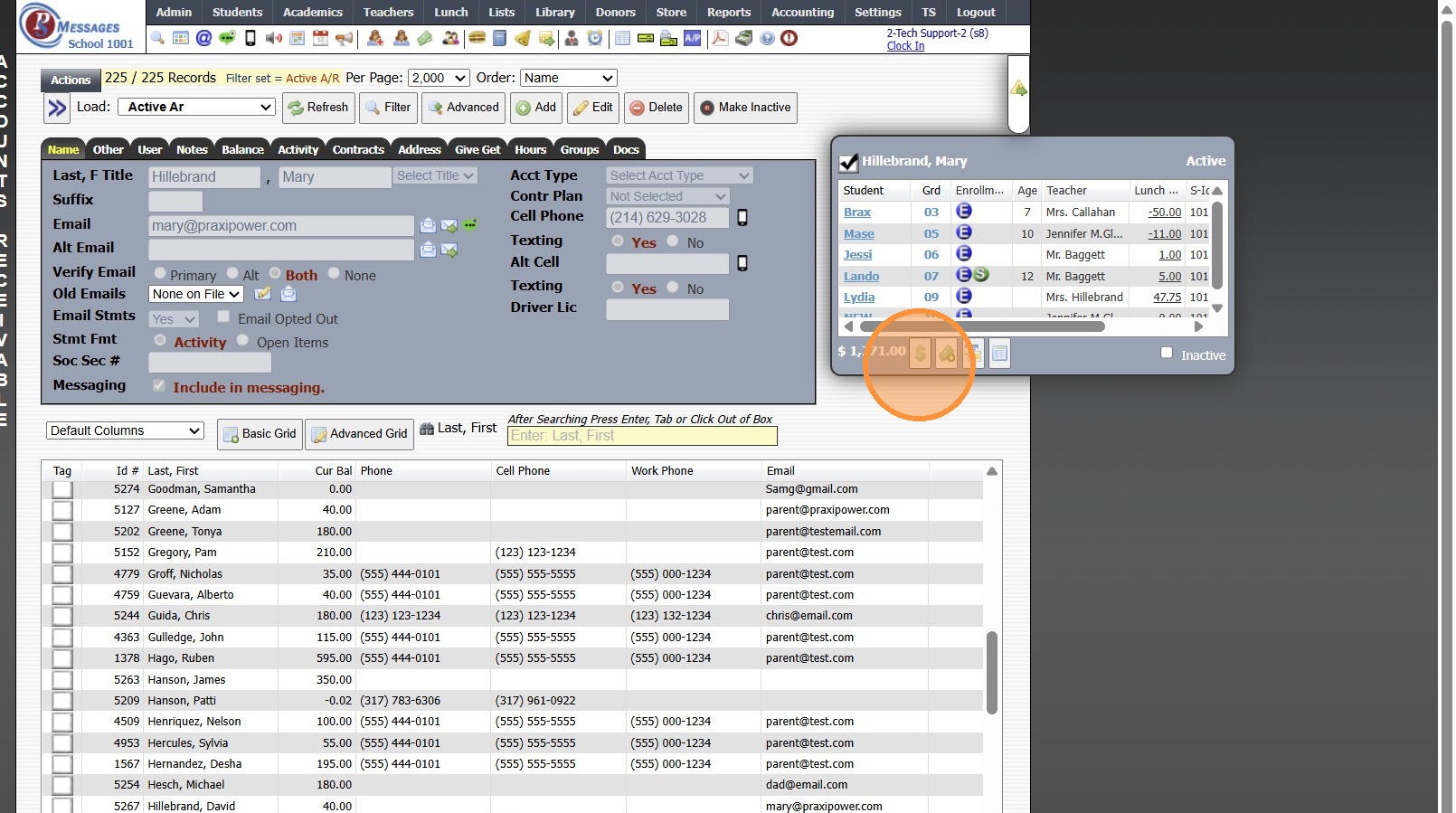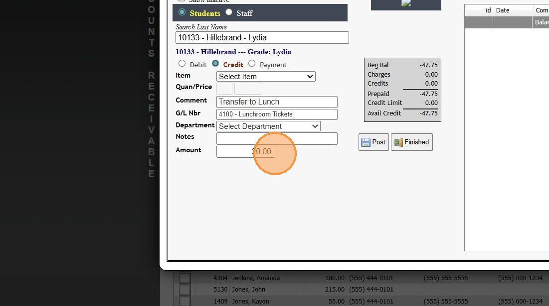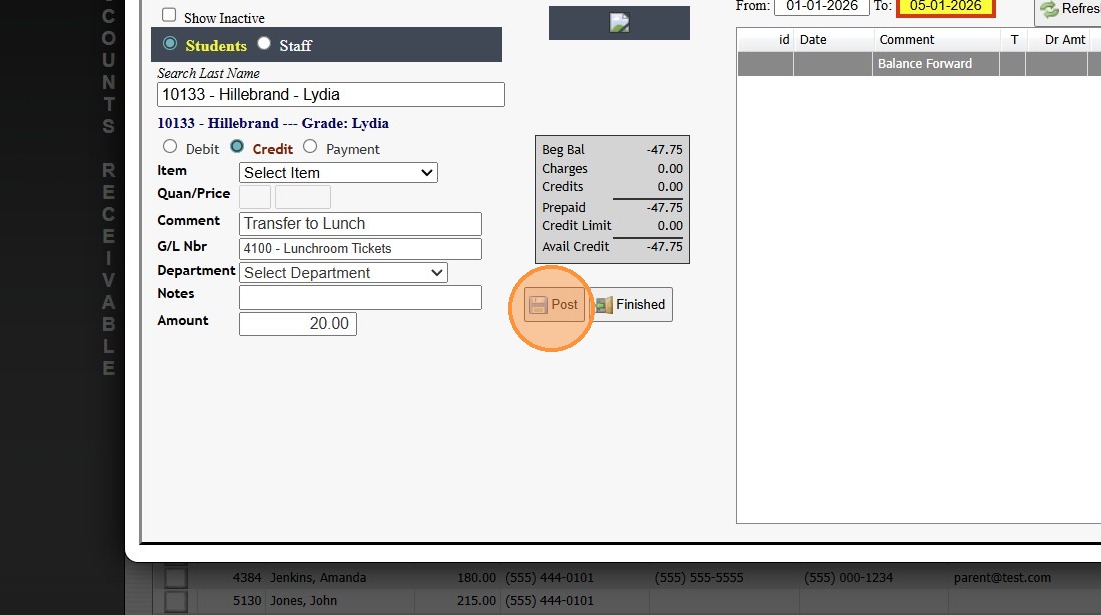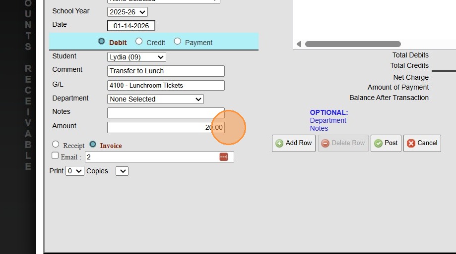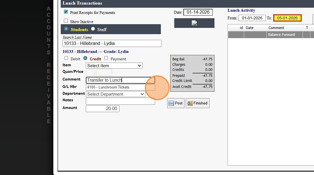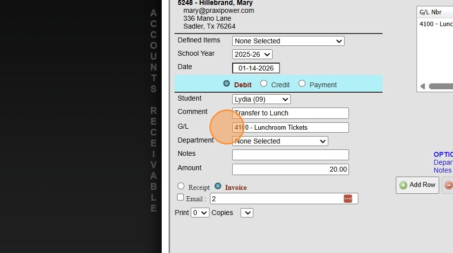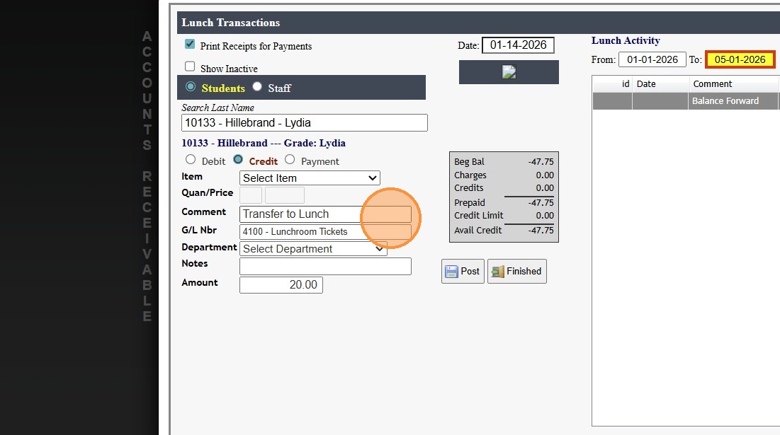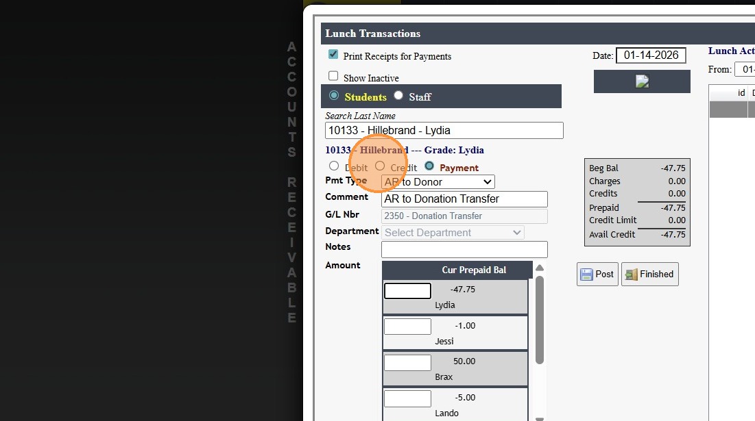 Posting a Check Payment That Includes Both AR & Lunch Payments Posting a Check Payment to the Accounts Receivable that Includes Funds for a Students Lunch Account. 1. Log into PraxiSchool 2. Click "Admin" 3. Click "Accounts Receivable" 4. Search for ...
