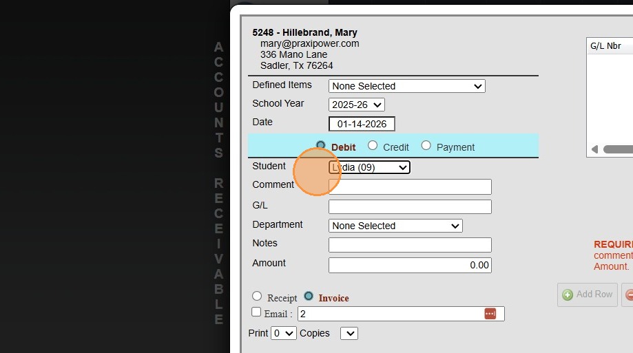 Adding a Transaction Item to a Student's AR Account Adding a Transaction Item to a Student's AR Account from Defined Items or Manually 1. Log into PraxiSchool 2. Click "Admin" 3. Click "Accounts Receivable" 4. Select Billing Account 5. Click $ to Add ...