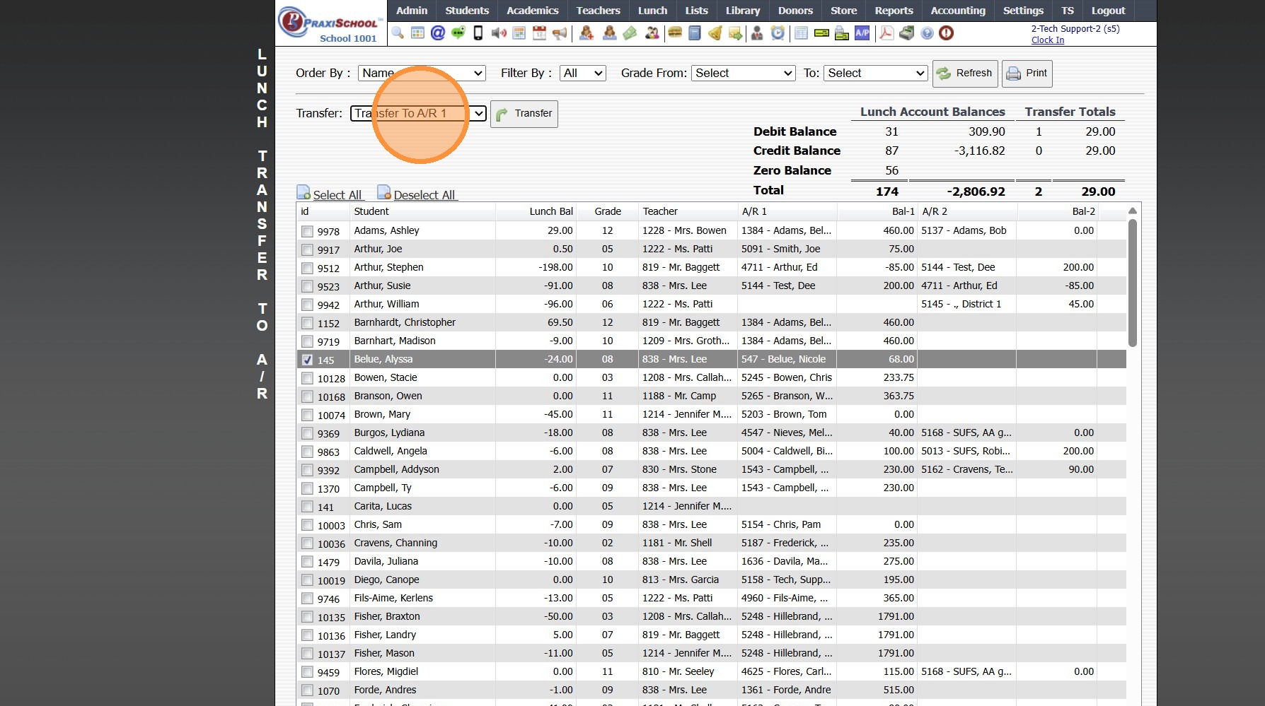 1. Click "Lunch" 2. Click "Process Transactions" 3. Click "Transfer To A/R" Transferring Owed & Credit Balances 4. Select "<> 0 " Transferring Owed Balances Only 5. Select "> 0 " 6. Set Grade Levels 7. Click "Refresh" 8. Select "Transfer To A/R 1" to ...