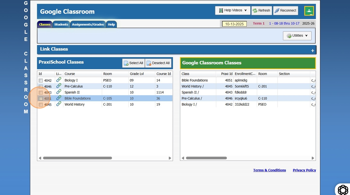 Unlinking Student in PraxiSchool Class with Google Classroom Student 1. Click "Teachers" 2. Click "Google Classroom" 3. Click "Students" 4. Select the "4042 - Biology I - Mrs. Hillebrand" option. 5. Check student you want to unlink. These must be ...