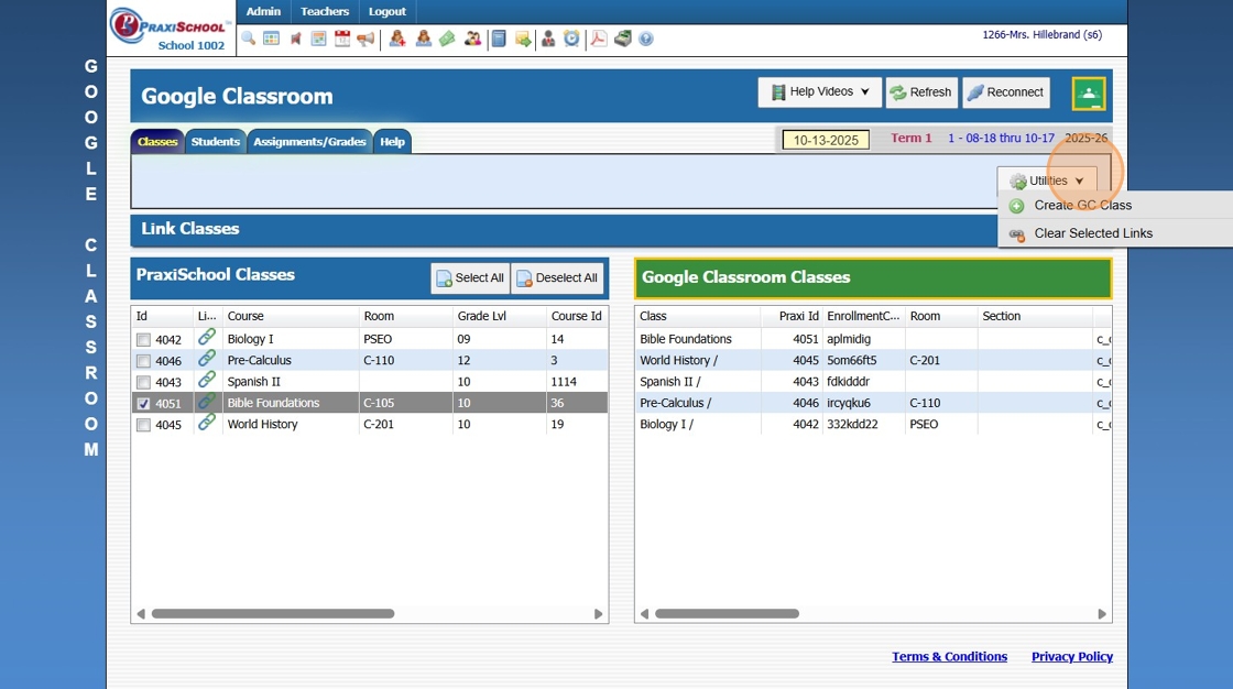 How to Create a Google Classroom Class from PraxiSchool 1. Go to Teachers/Google Classroom 2. Click "Classes" 3. Check Class you want to create in Google Classroom 4. Click "Utilities" 5. Click "Create GC Class" 6. Switch to Google Classroom and ...