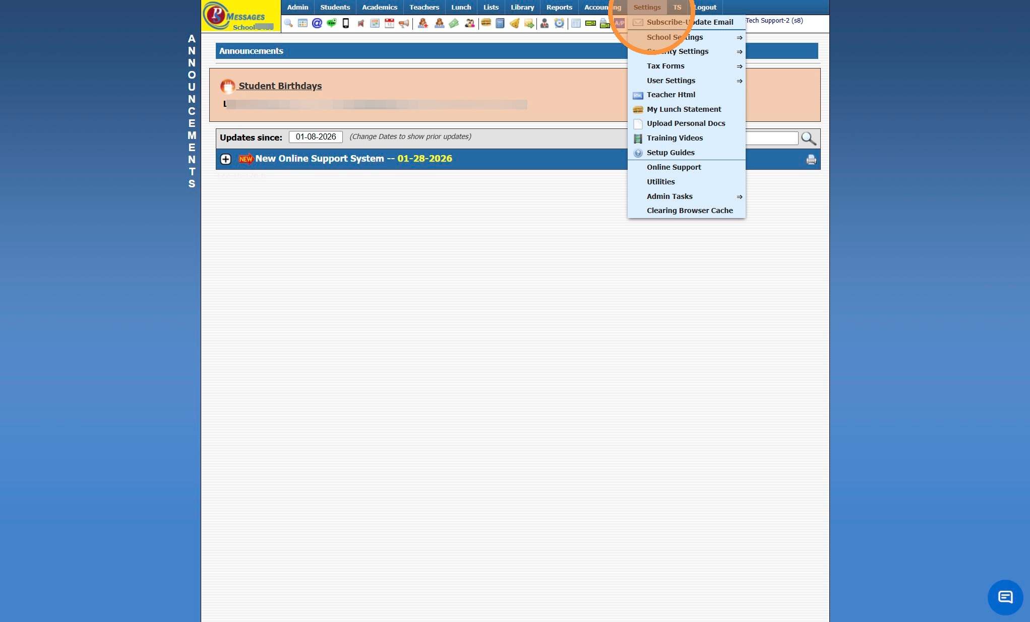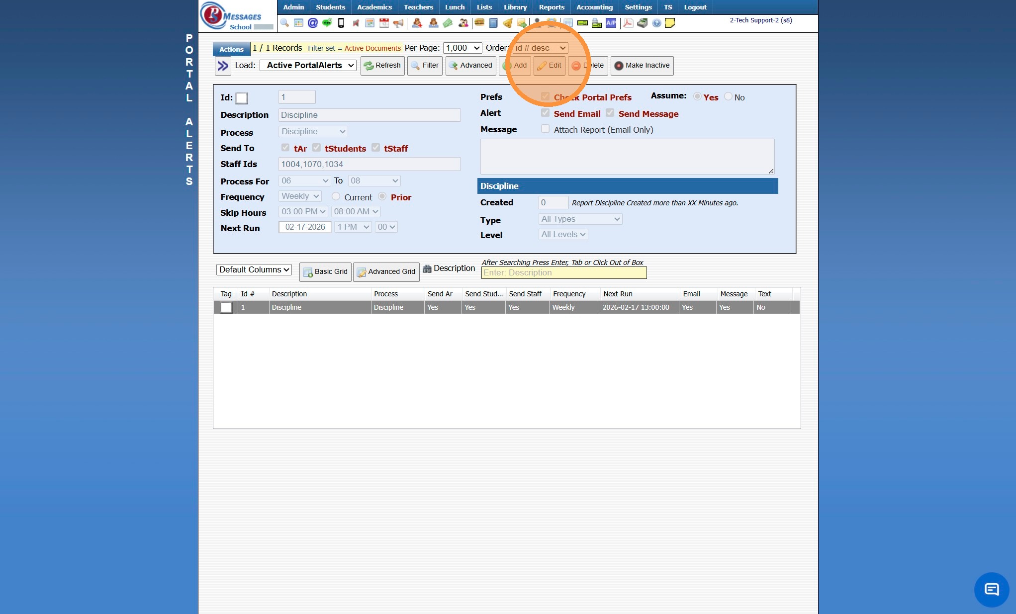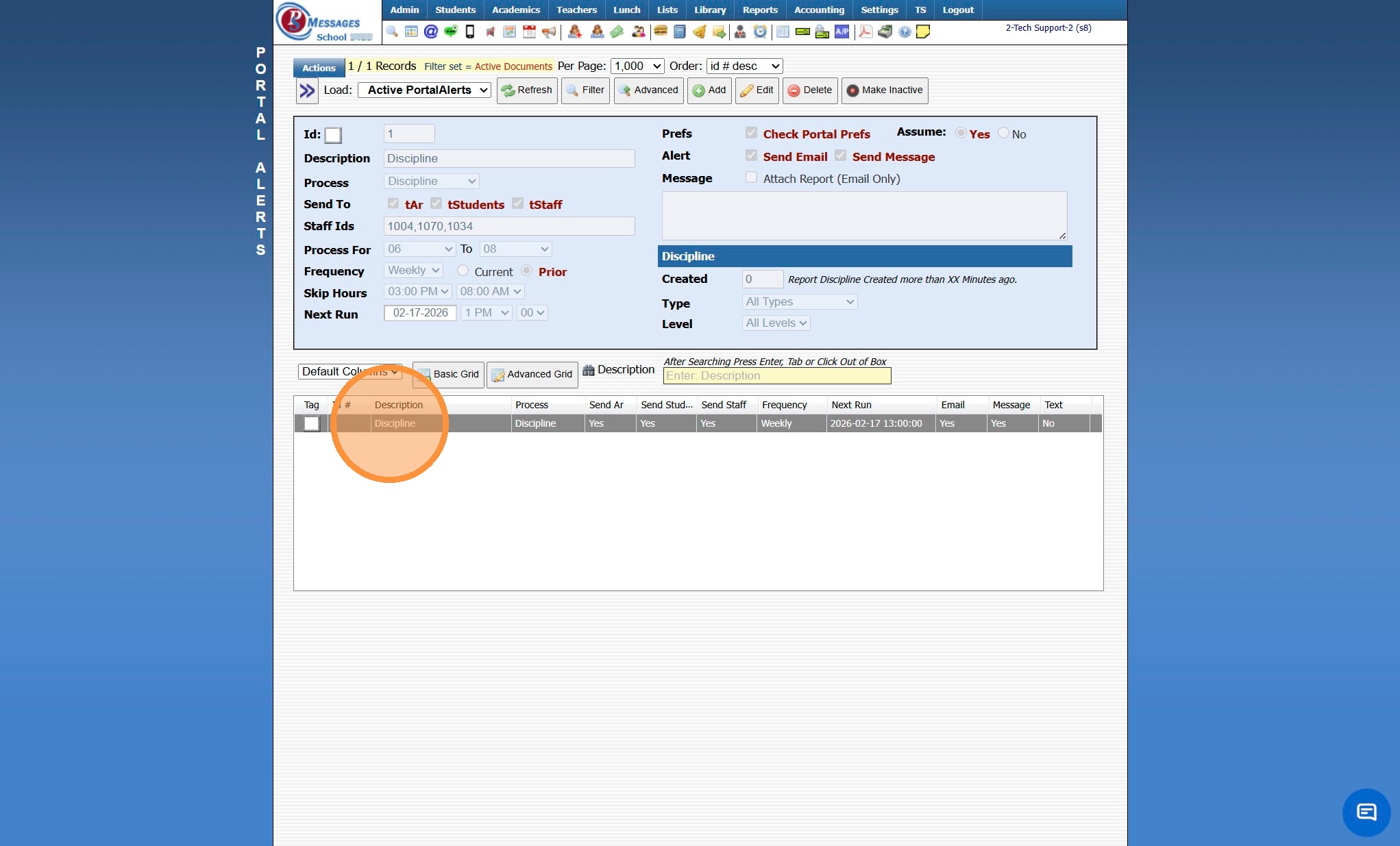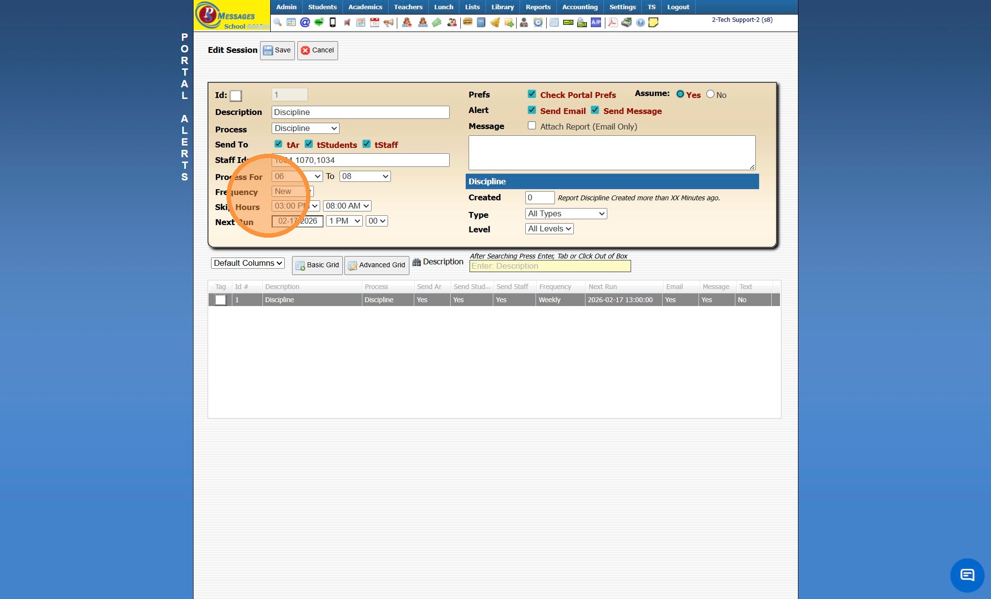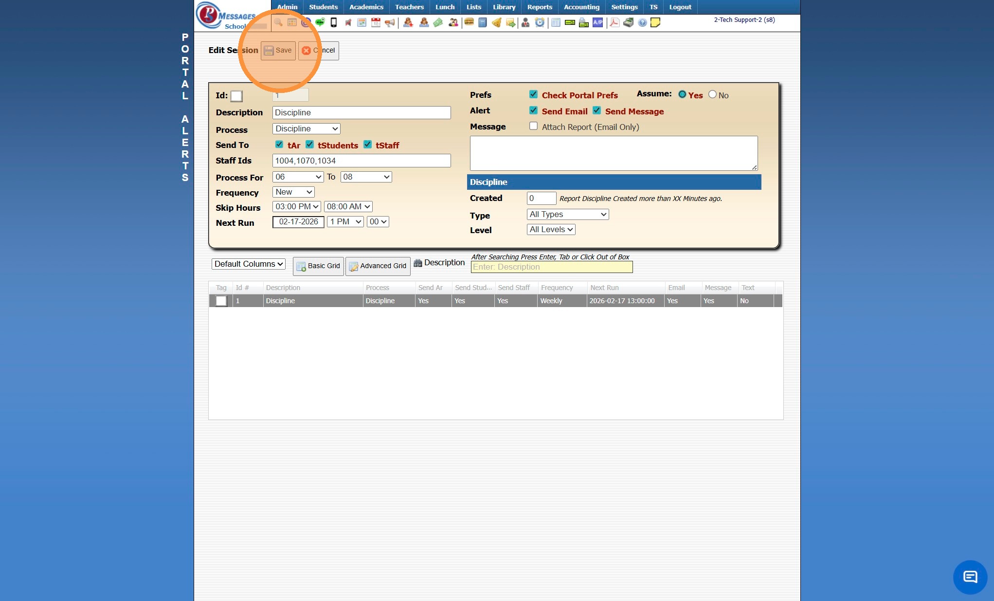 Clock Alerts 1. Log into PraxiSchool 2. Click "Admin" 3. Click "Clock" 4. Click "Clock Alerts" 5. Set Date From and Date To & Click "Refresh" 6. Click "Add" 7. Select Alert For Option: All - All Students, Staff and Family will receive the Alert ...