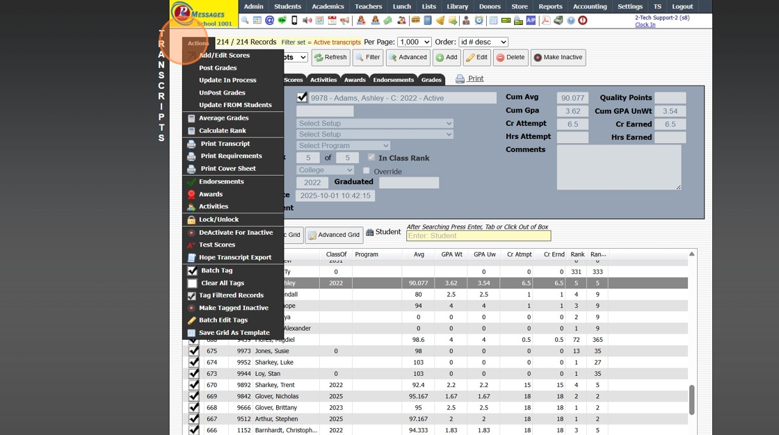 Calculate Class Rank for Transcripts 1. Click "Academics" 2. Click "Transcripts" 3. Click "Transcripts" 4. Select a Student Transcript with the Class Of to be Calculated 5. Click "Actions" 6. Average Grades for the Class Of Year 7. Click "Actions" 8. ...