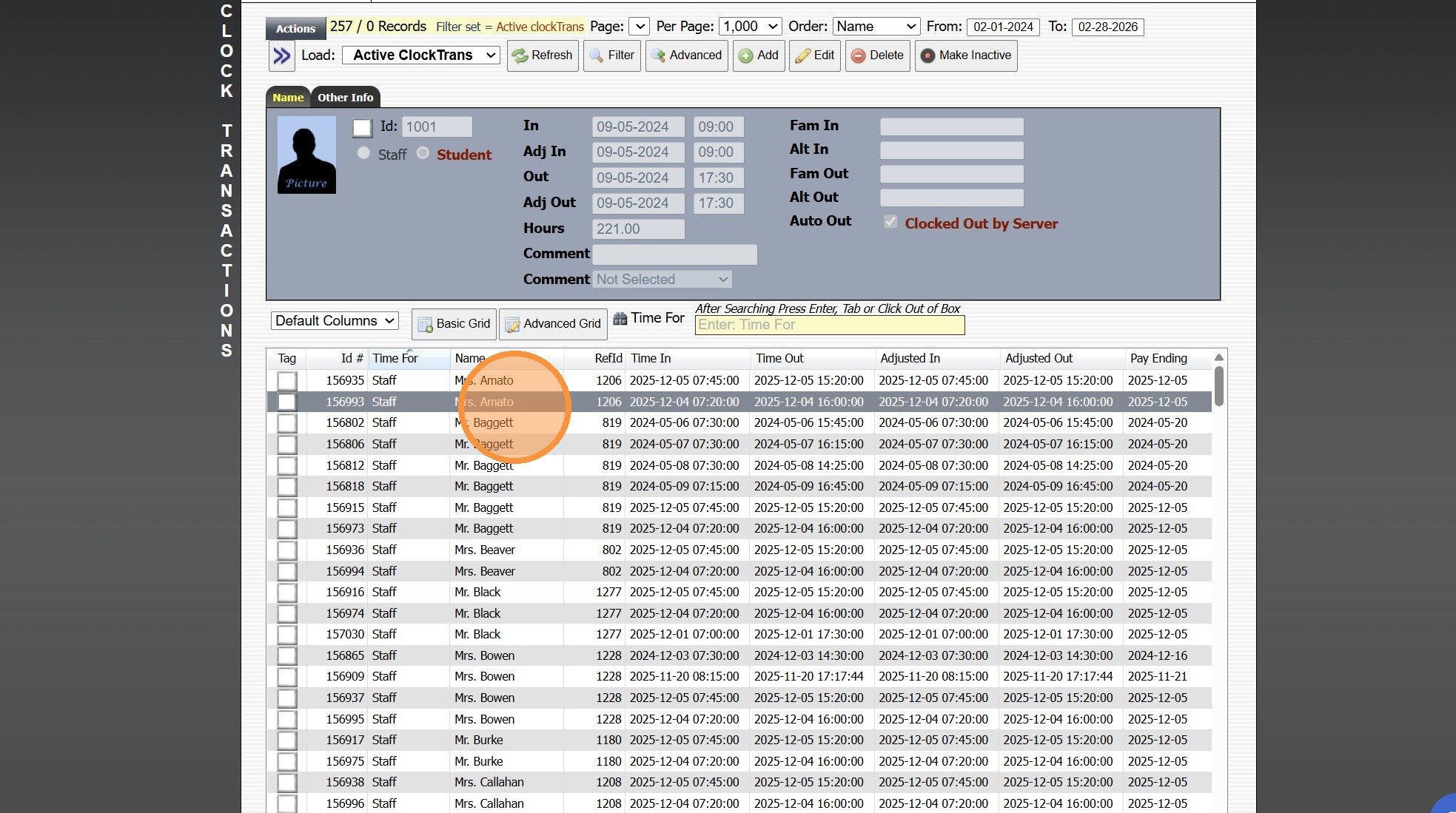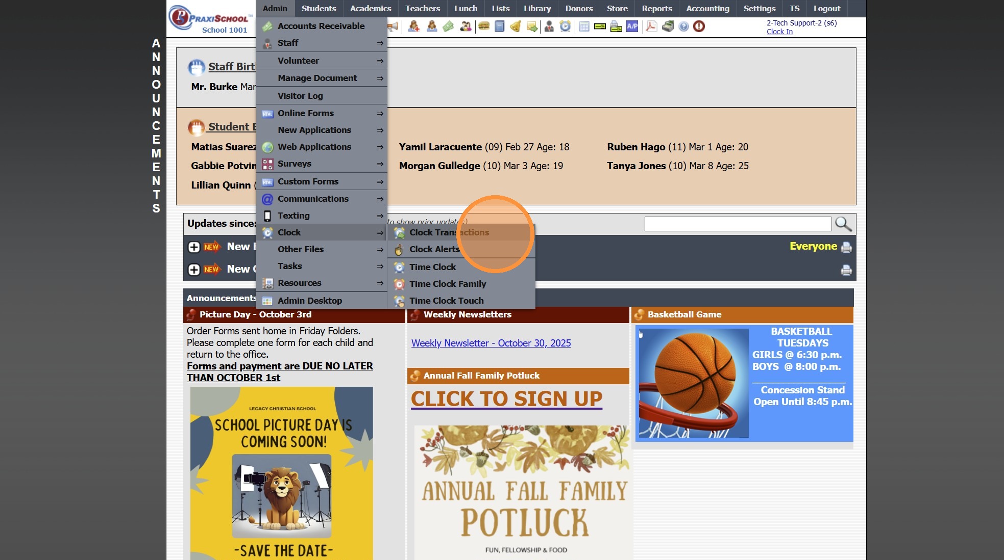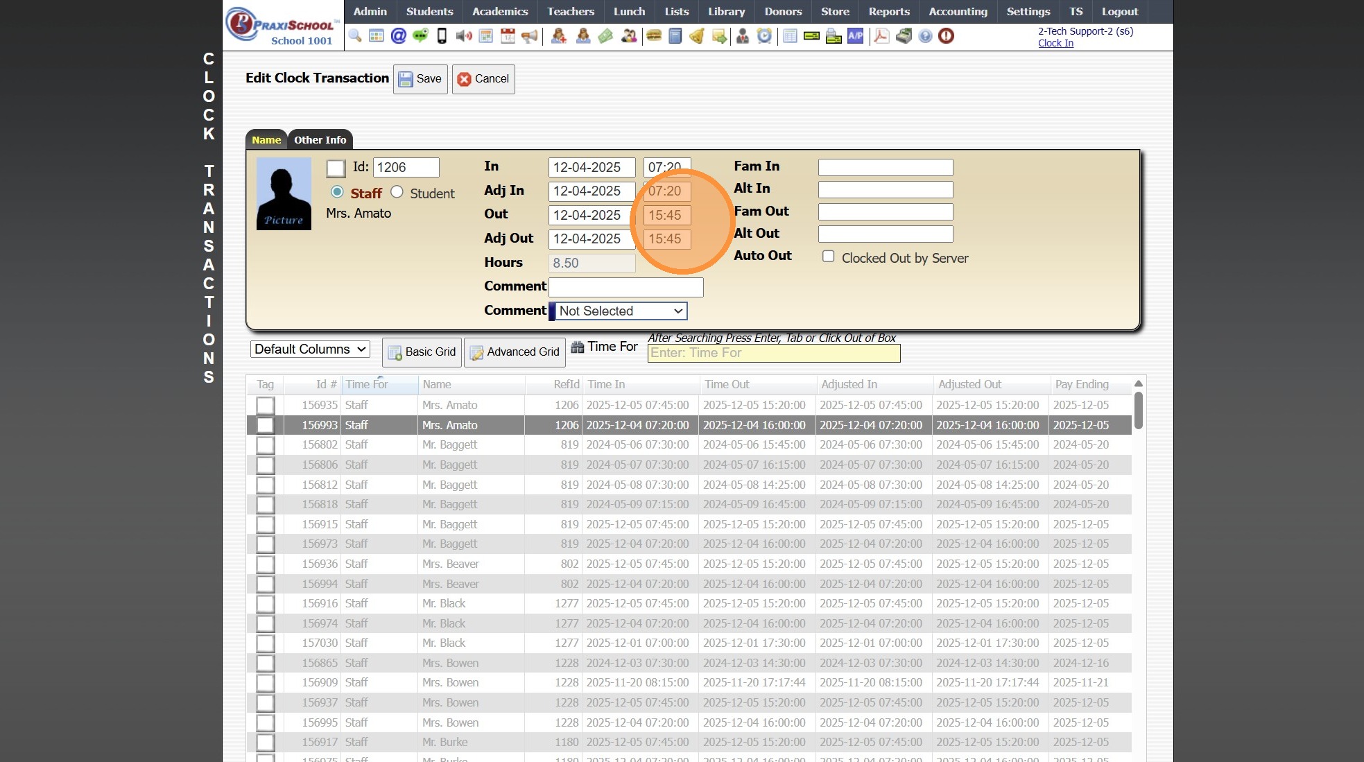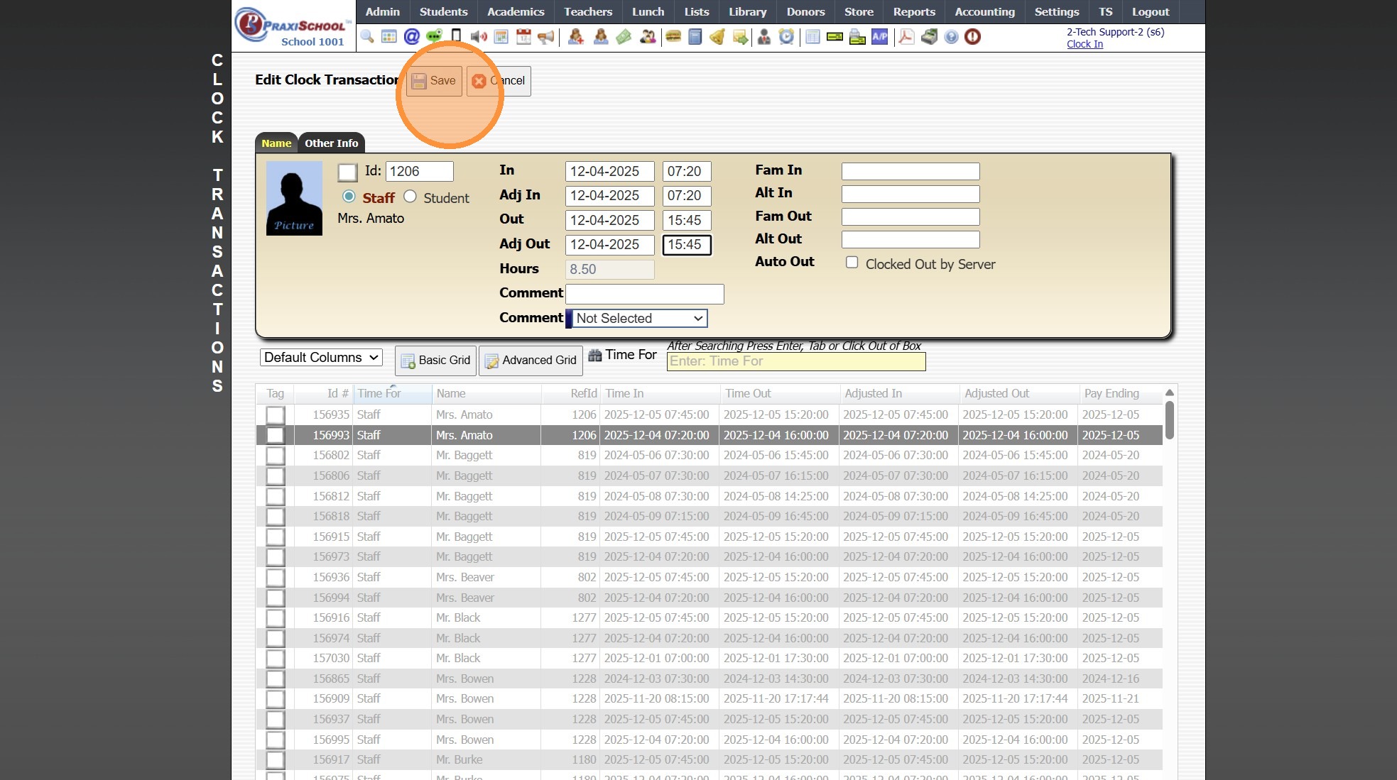 Time Clock Transactions 1. Log into PraxiSchool 2. Click "Admin" 3. Click "Clock" 4. Click "Clock Transactions" 5. Set Date From and Date To & Click "Refresh" 6. Click on a Timeclock Transaction to View Clock Details 7. Select Grid Report 8. Click ...