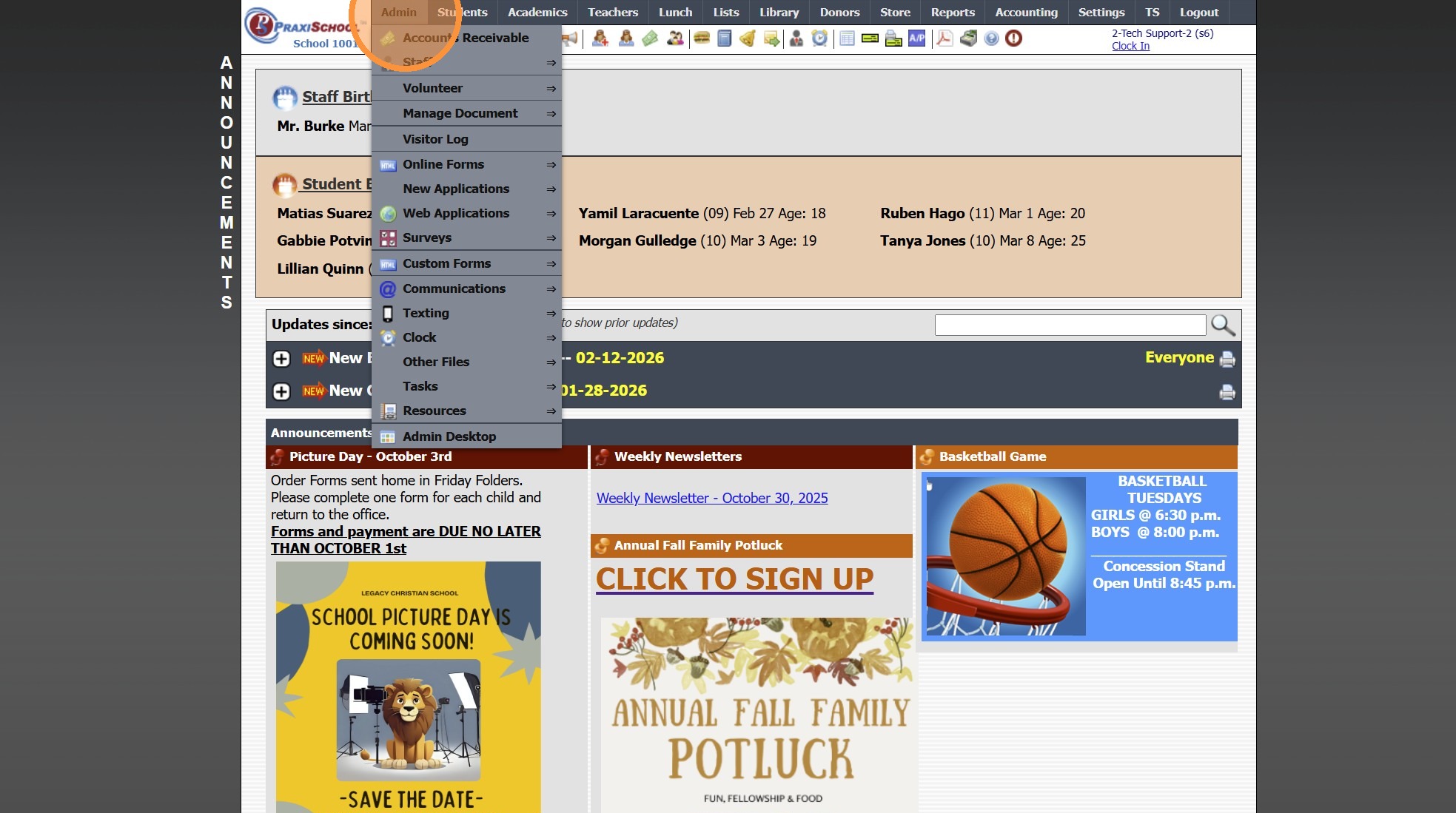 Updating Staff Attendance from Time Clock Transactions 1. Click "Admin" 2. Click "Staff" 3. Click "Staff Attendance Wizard" 4. Click "Update From Time Clock" 1000.2.7