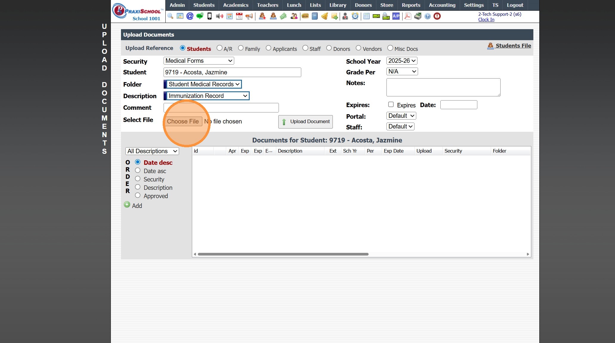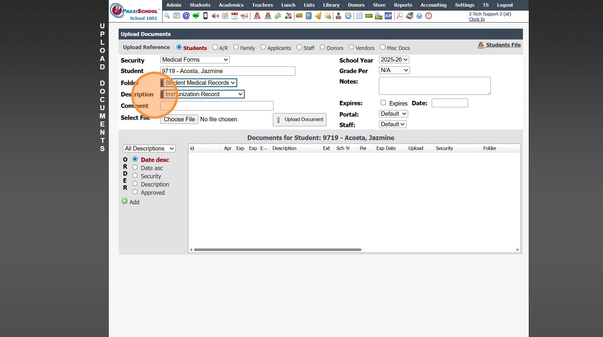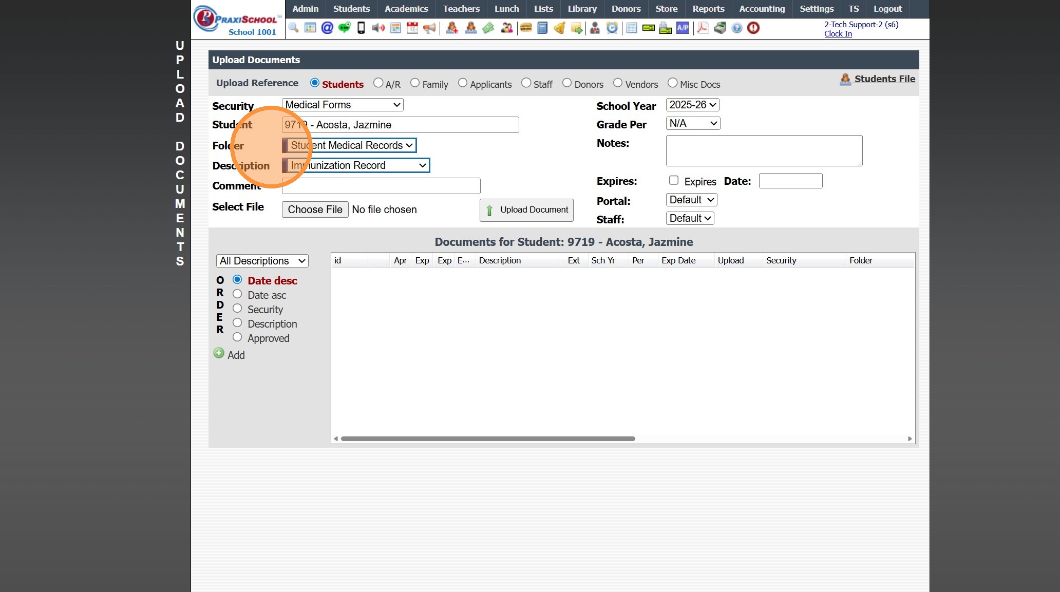1. Click "Students" 2. Click "Students" 3. Select Student 4. Click the "Docs" Tab 5. Click "Add" 6. Select the Security, Folder & Description 7. Click "Choose File" 8. Verify School Year 9. Click "Upload Document" 1000.4.1.1