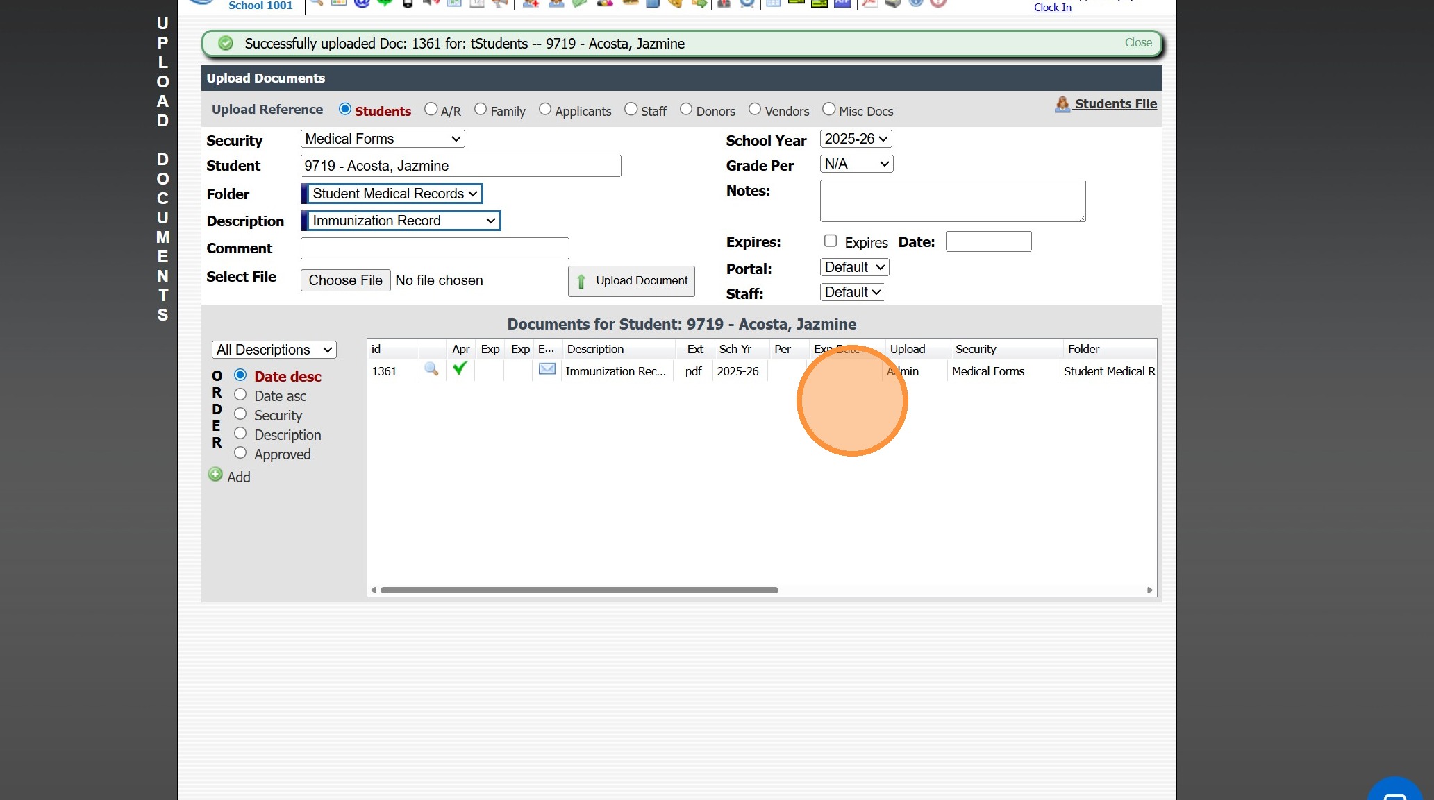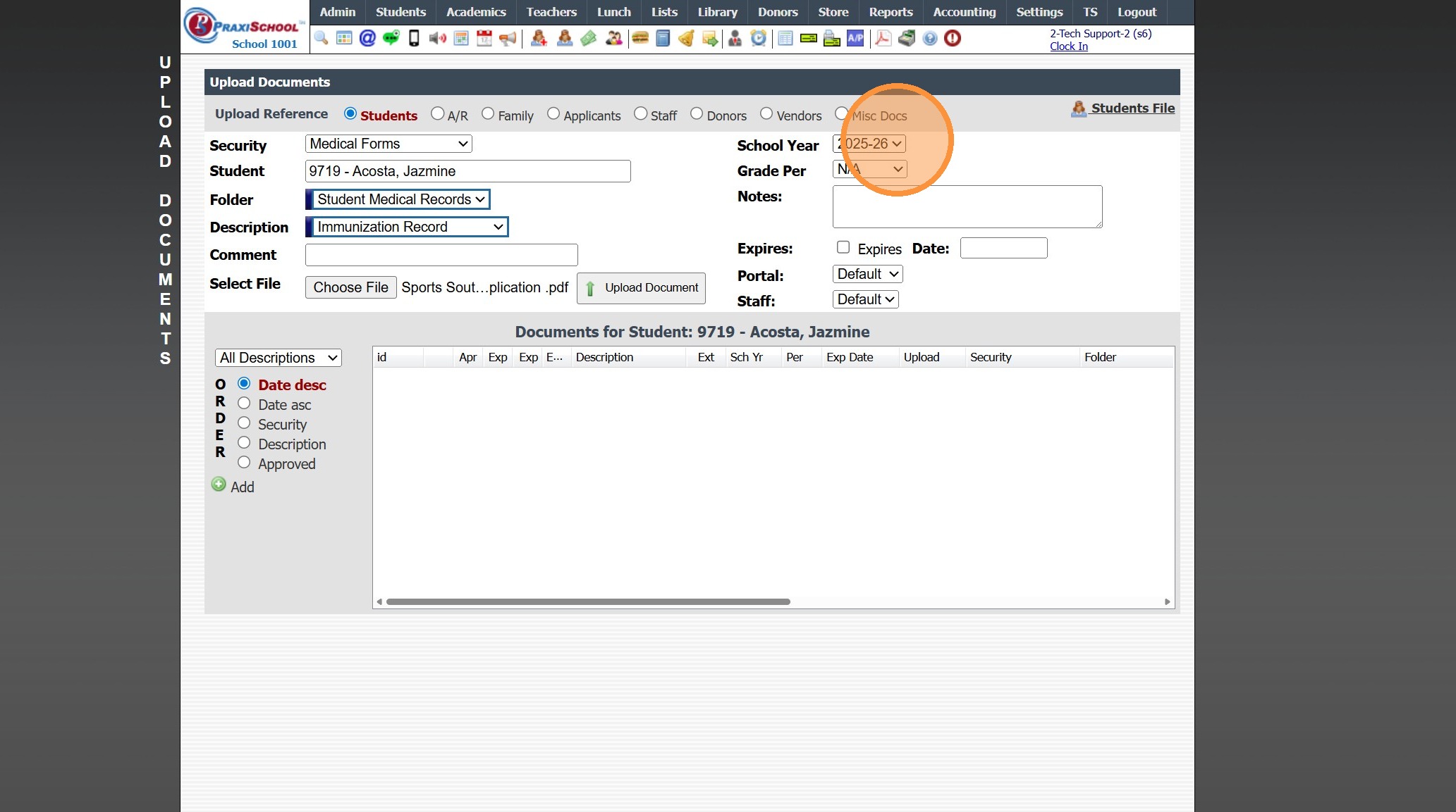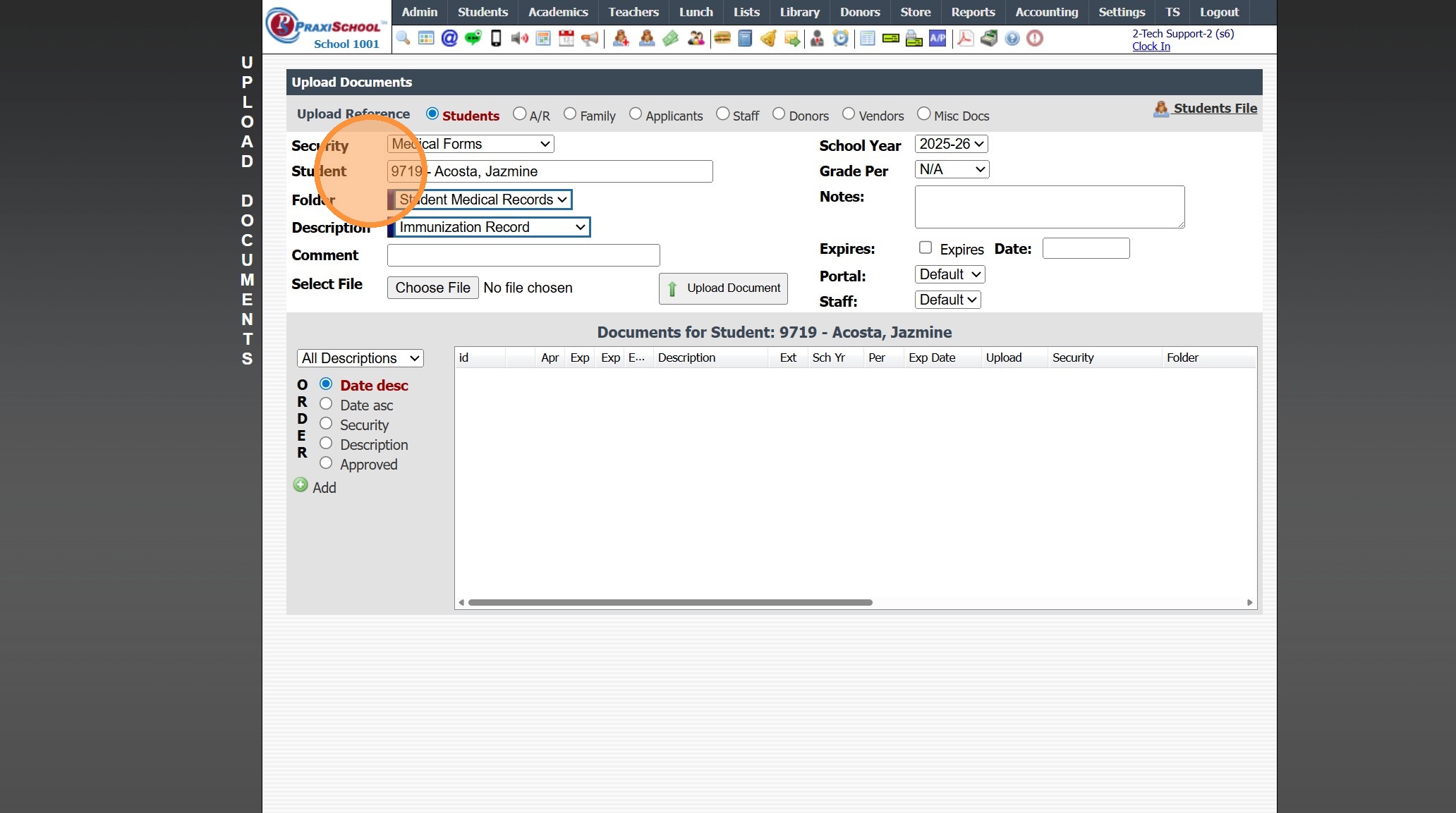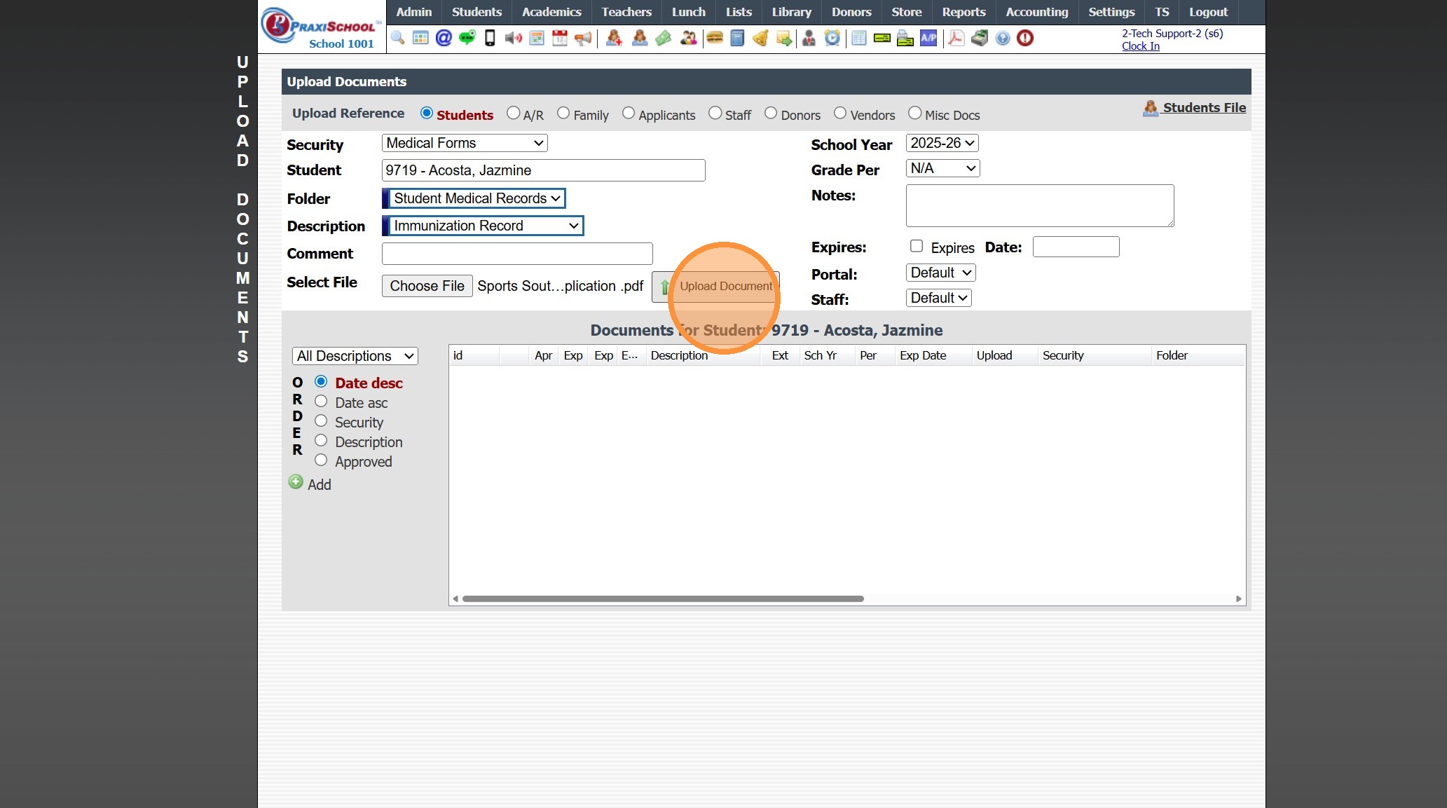 1. Click "Students" 2. Click "Students" 3. Select Student 4. Click the "Docs" Tab 5. Click "Add" 6. Select the Security, Folder & Description 7. Click "Choose File" 8. Verify School Year 9. Click "Upload Document" 1000.4.1.1