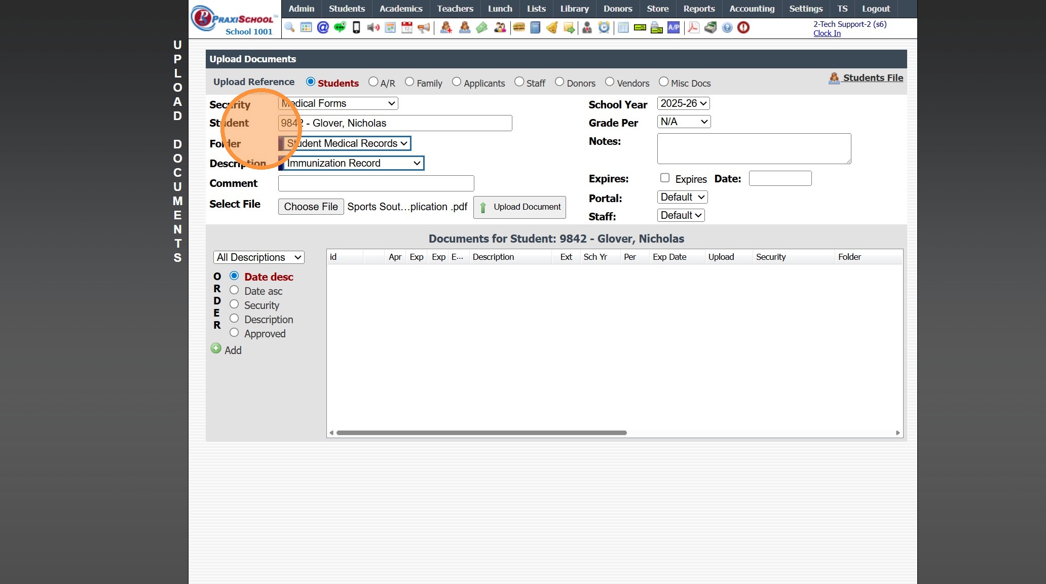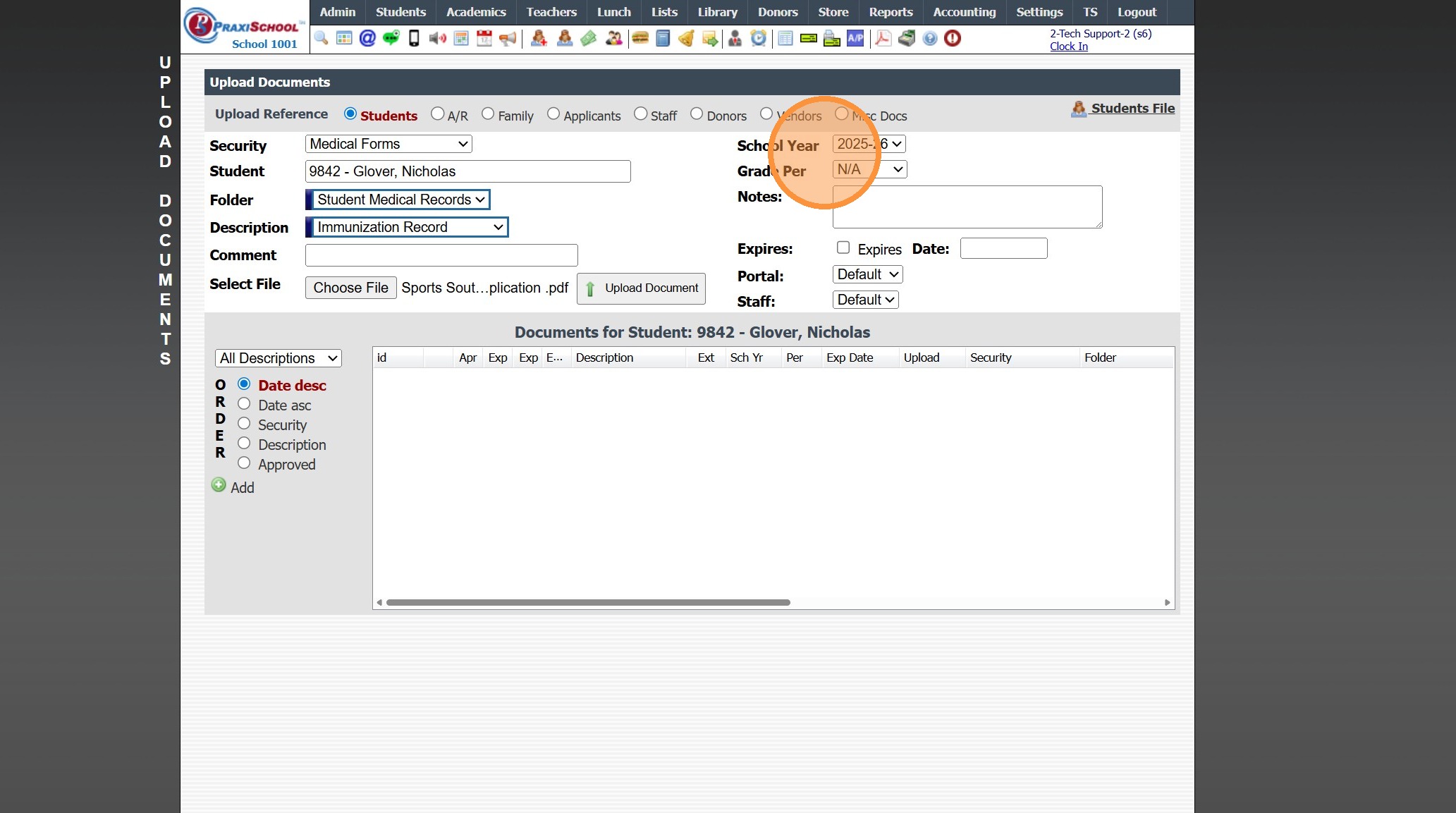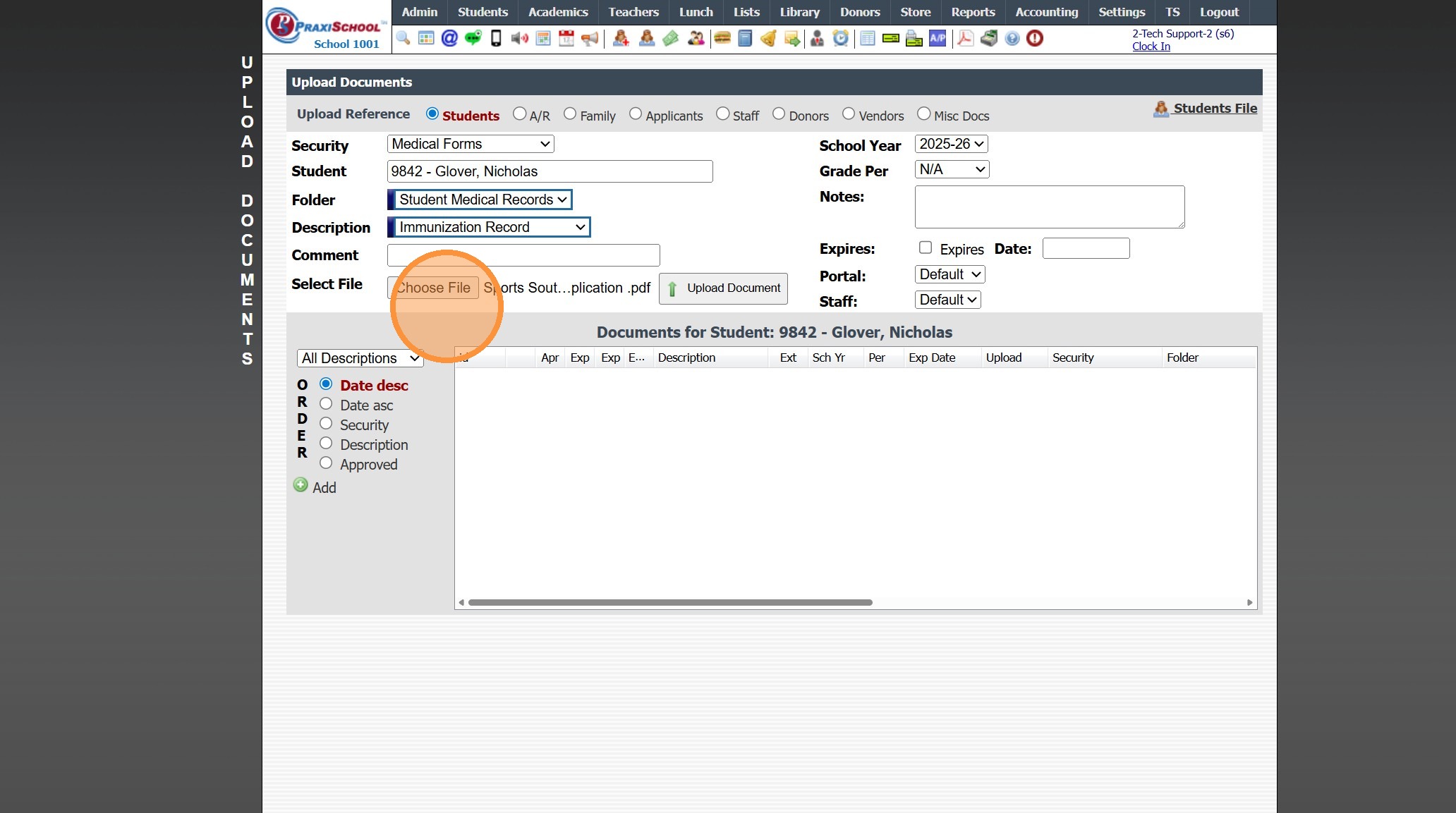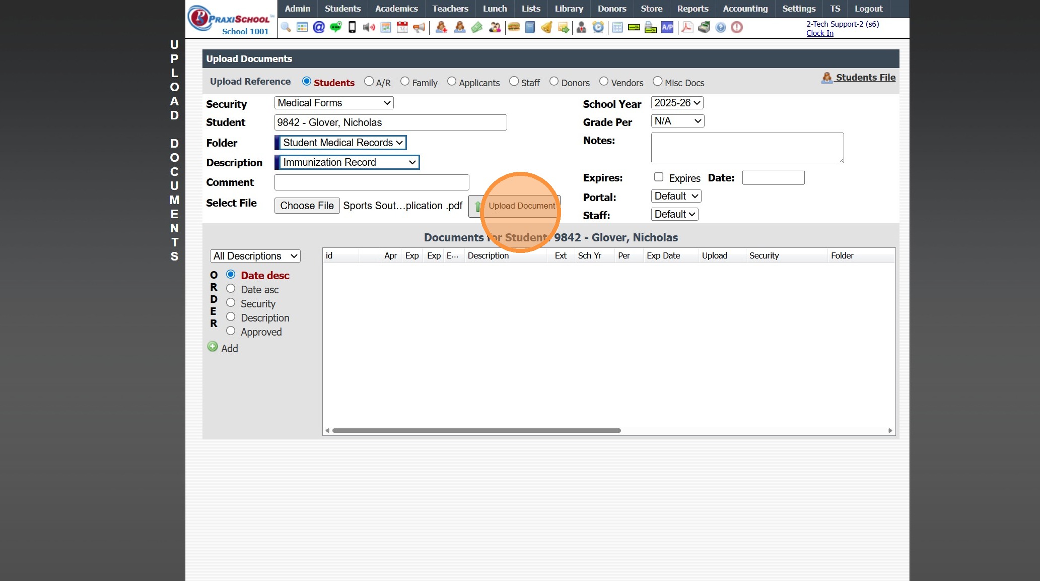 1. Click "Admin" 2. Click "Manage Document" 3. Click "Upload Documents" 4. Select the "Security" 5. Select the "Student" 6. Select the "Folder" 7. Select the "Description" 8. Click "Choose File" & Select Document to Upload 9. Verify School Year 10. ...