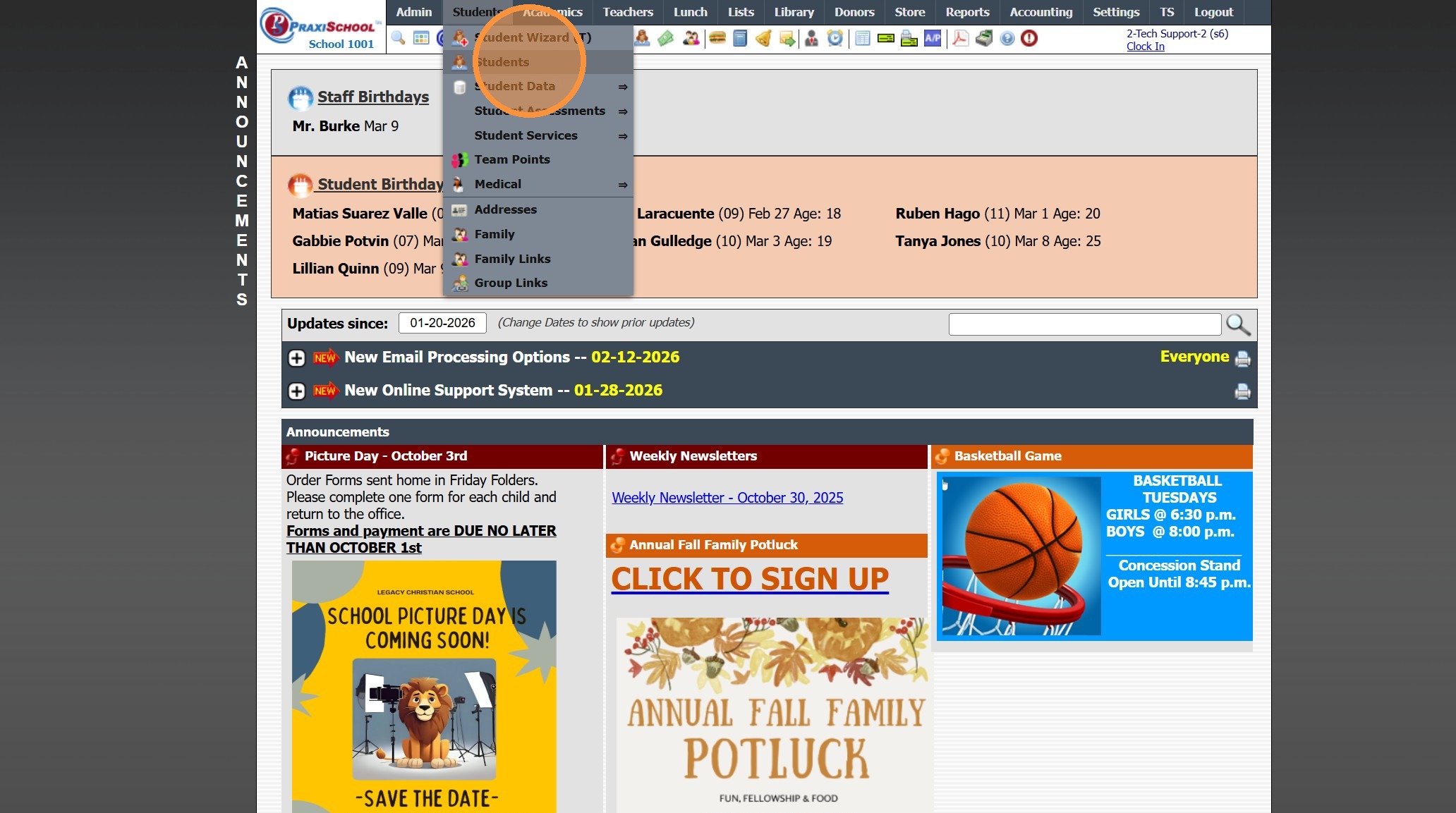 Accessing Student Family Contact Information from the Student File 1. Log into PraxiSchool 2. Click "Students" 3. Click "Students" and Select Student 4. Click "Actions" 5. Click "Family Contacts" 6. The Selected Student's Family Contacts Report will ...