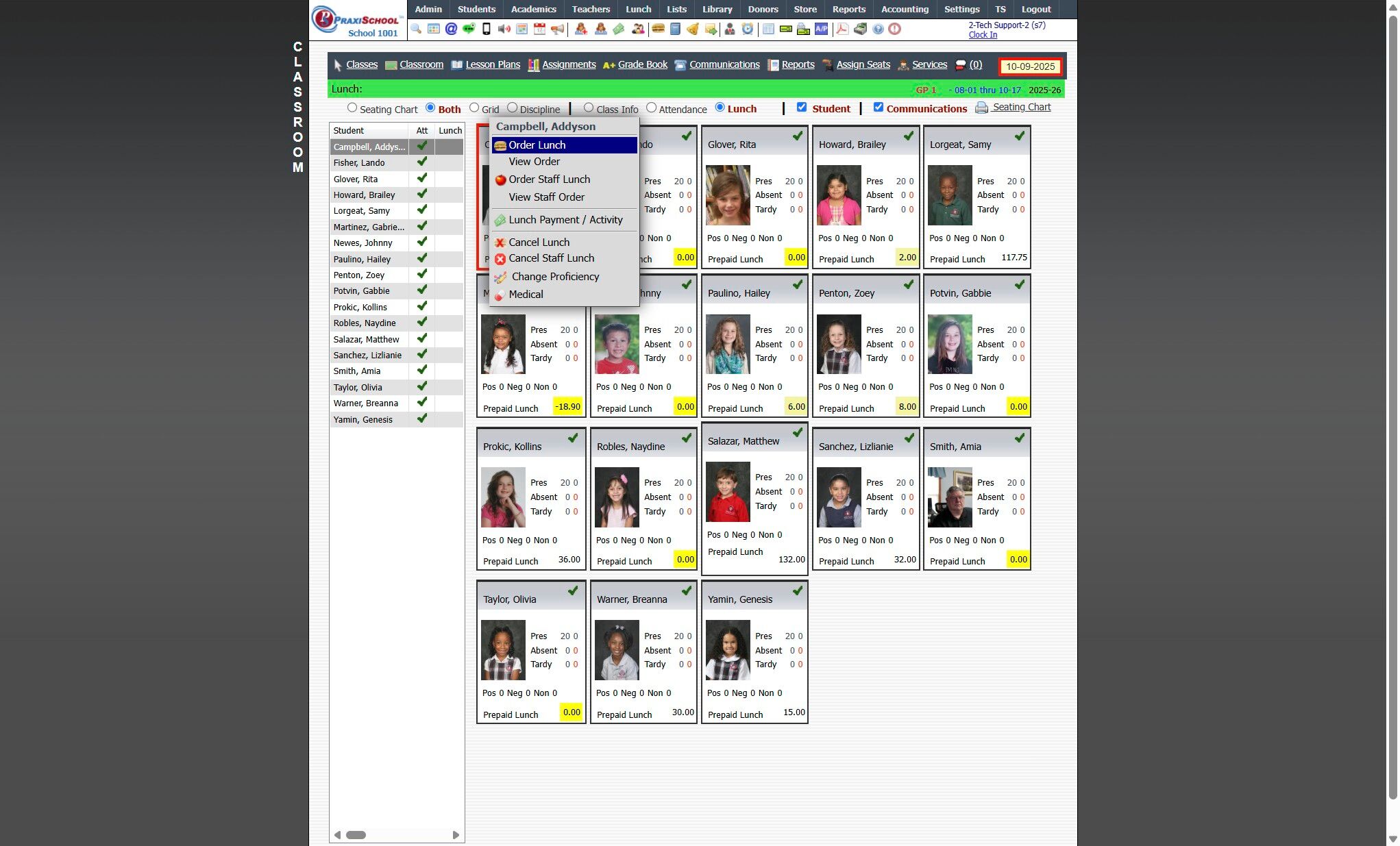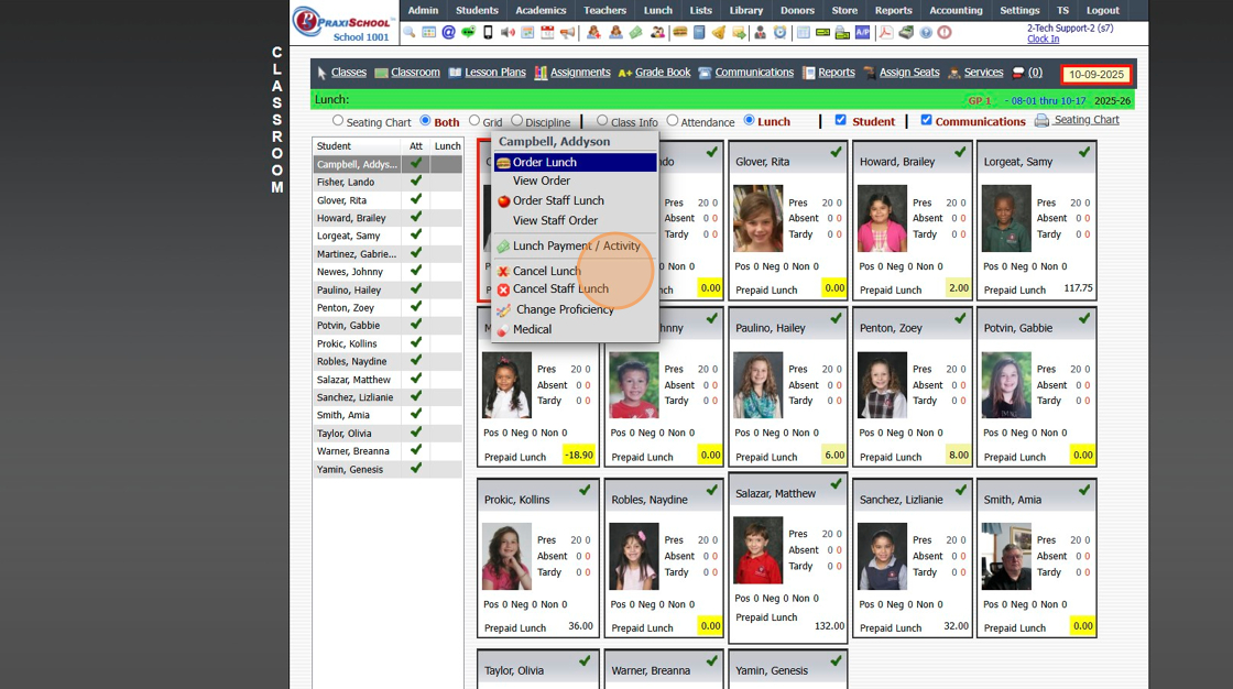 Ordering Student Lunch From Classroom 1. Log into PraxiSchool 2. Click "Teachers" 3. Click "Classroom" 4. Select Class 5. Click "Classroom" Alert: Lunch Cannot be Ordered for a Student in the Classroom Until Attendance has been Entered for the Day 6. ...
