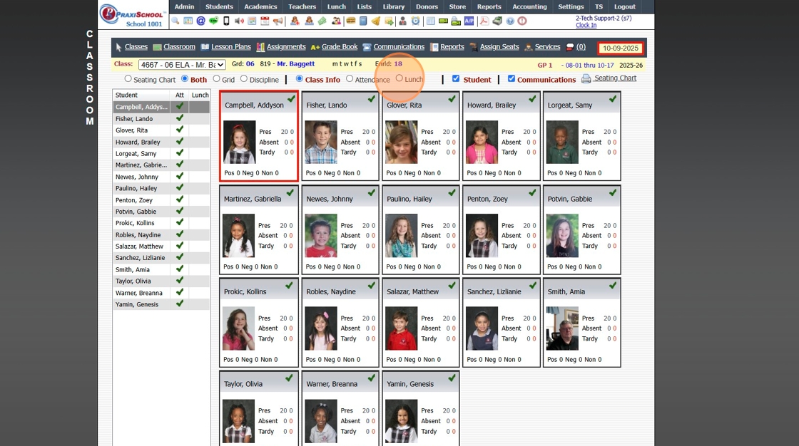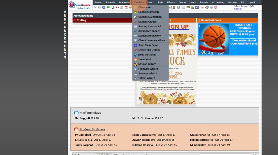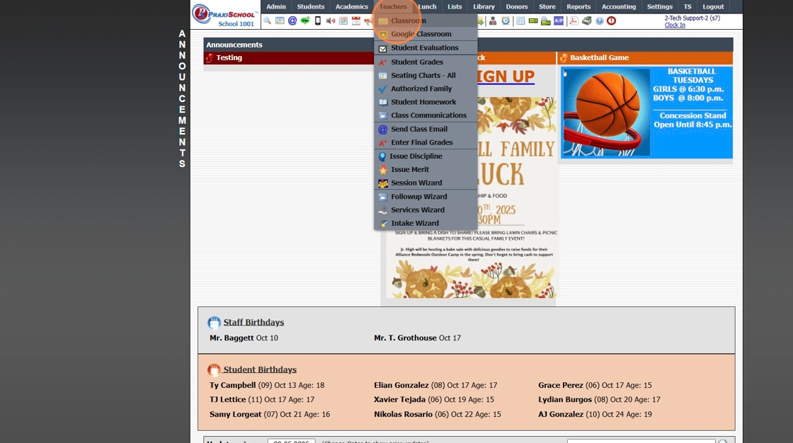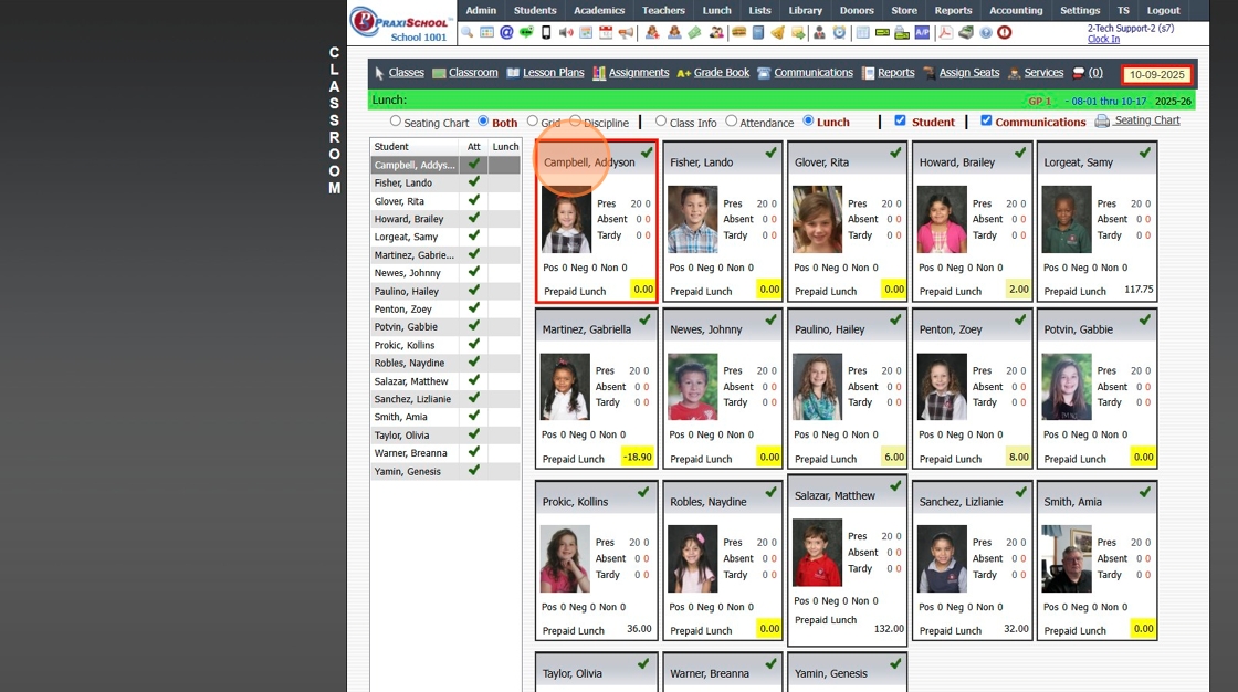 Ordering Teachers Lunch From Classroom 1. Log into PraxiSchool 2. Click "Teachers" 3. Click "Classroom" 4. Select Class 5. Click "Classroom" 6. Click the "Lunch" Toggle 7. Left Click on any Student 8. Click "Order Lunch" 9. Enter Quantity Next to ...
