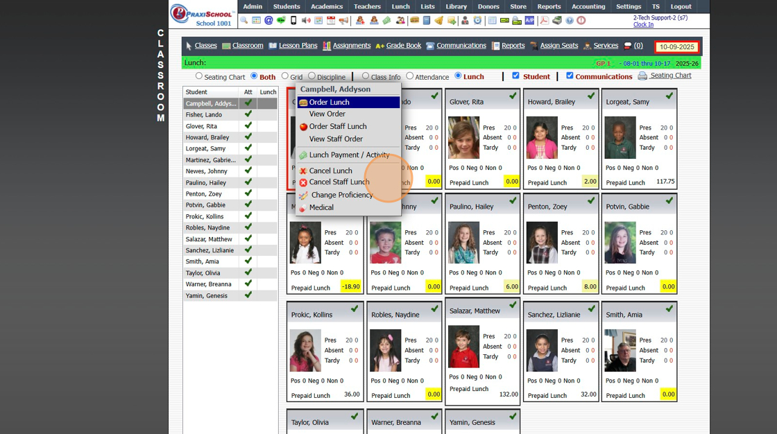 Canceling Lunch Orders From Classroom 1. Log into PraxiSchool 2. Click "Teachers" 3. Click "Classroom" 4. Select Class 5. Click "Classroom" 6. Click the "Lunch" Toggle 7. Left Click on any Student 8. Click "Cancel Lunch" to Cancel Student Lunch 9. ...