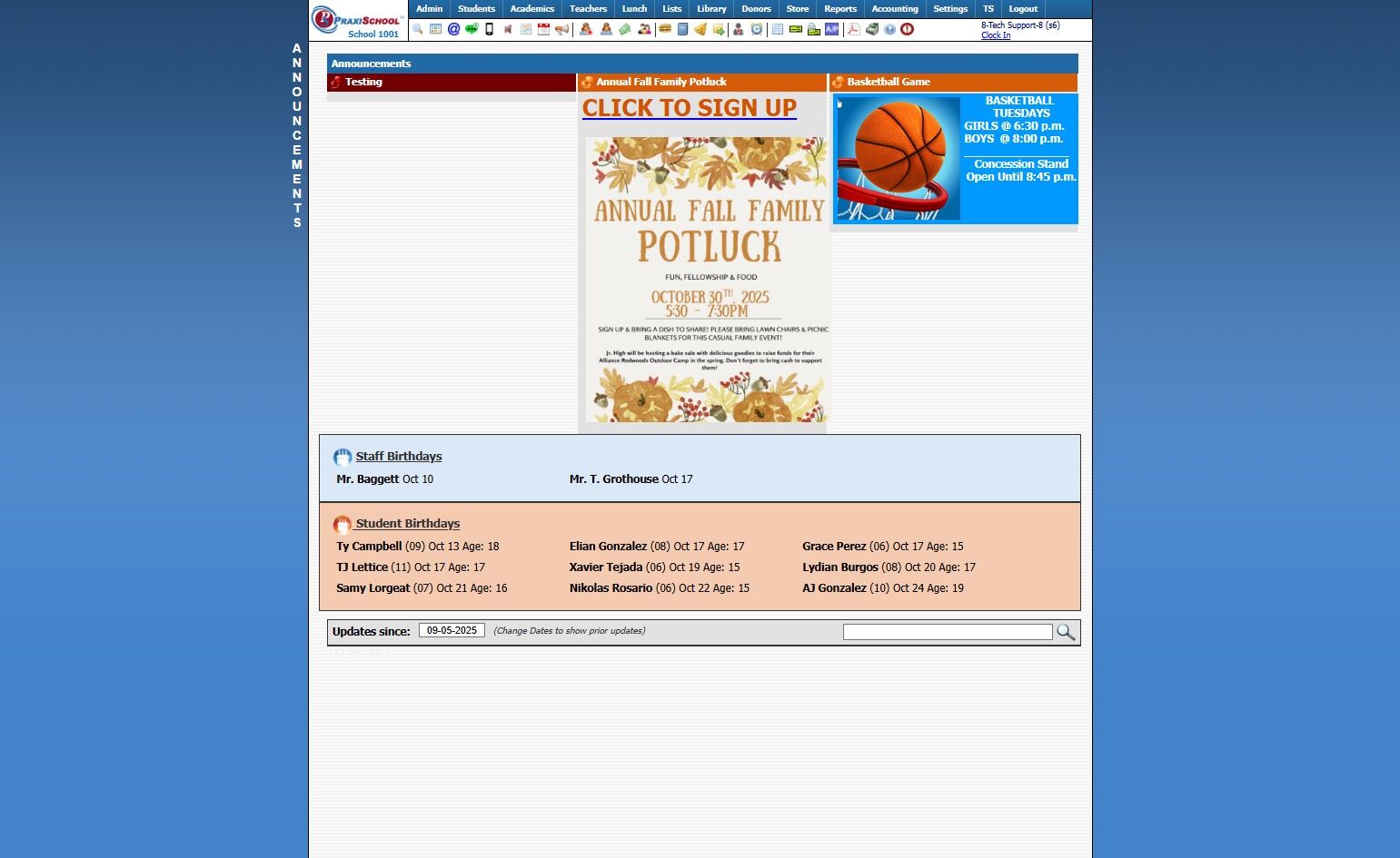 Creating School Calendar Items 1. Log into PraxiSchool 2. Click "Admin" 3. Click "Resources" 4. Click "School Calendar" 5. Click "Add" 6. Enter the Calendar Item Description 7. Select Type (Public, No School, Make-Up, Staff) Public, No School and ...