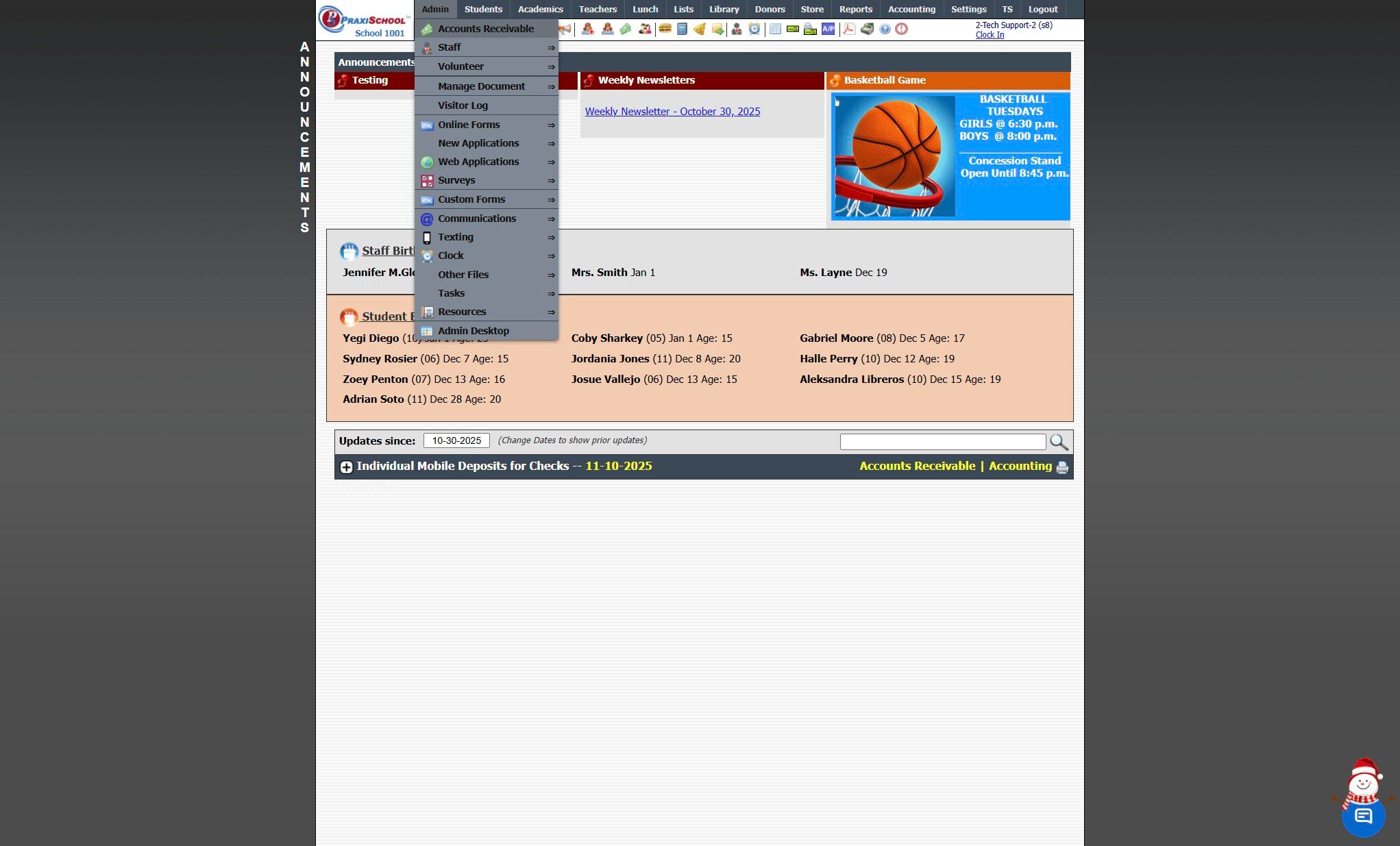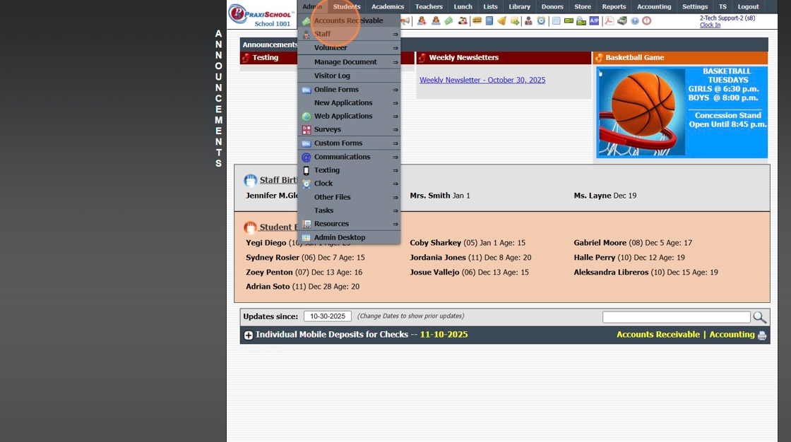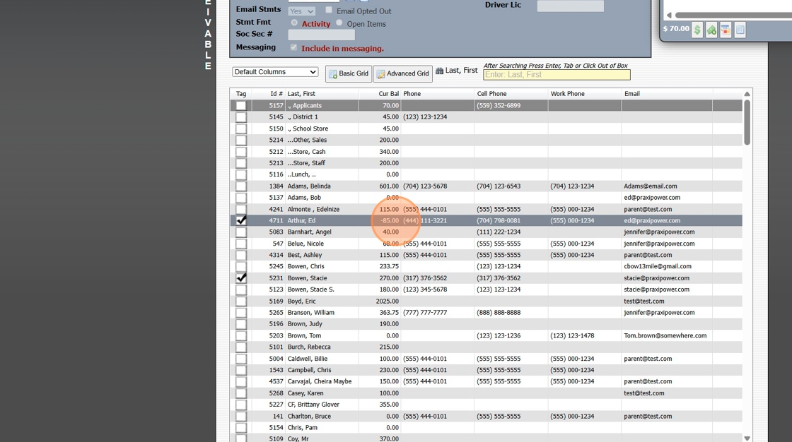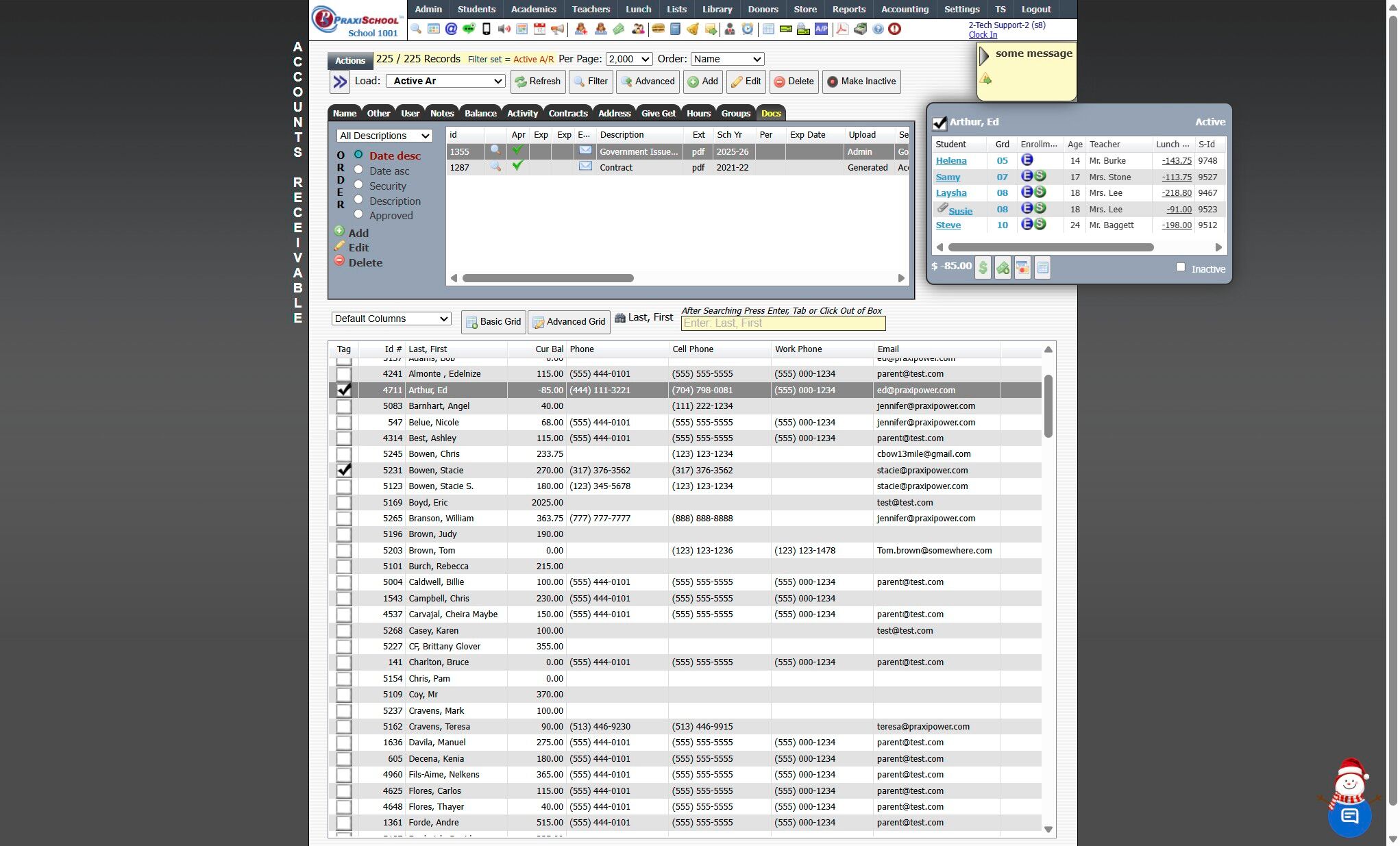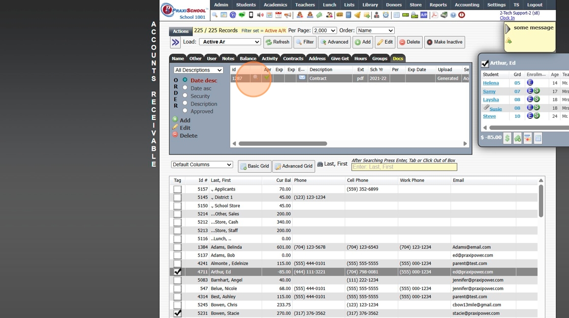 Printing/Emailing an Accounts Receivable Statement 1. Log into PraxiSchool 2. Click "Admin" 3. Click "Accounts Receivable" 4. Select Account 5. Click "Actions" 6. Click "Statements" 7. Click "Statements" 8. Enter the Detail Date Range 9. To Include ...