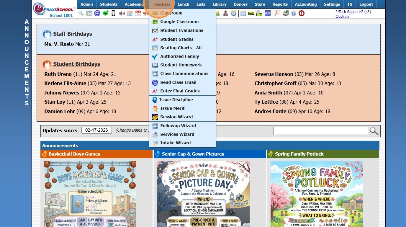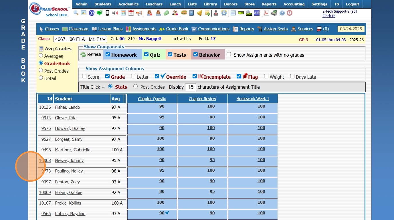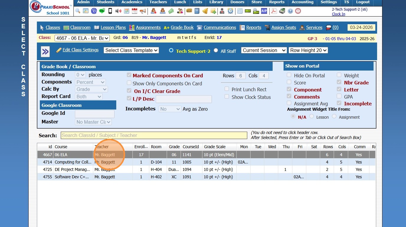 Moving Assignments and Grades to Correct Grade Period 1. Log into PraxiSchool 2. Click "Teachers" 3. Click "Classroom" 4. Select Class 5. Click "Assignments" 6. Select Component 7. Select Assignment 8. Click "Change Grade Period / Component" 9. ...
