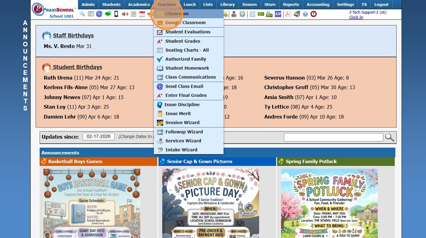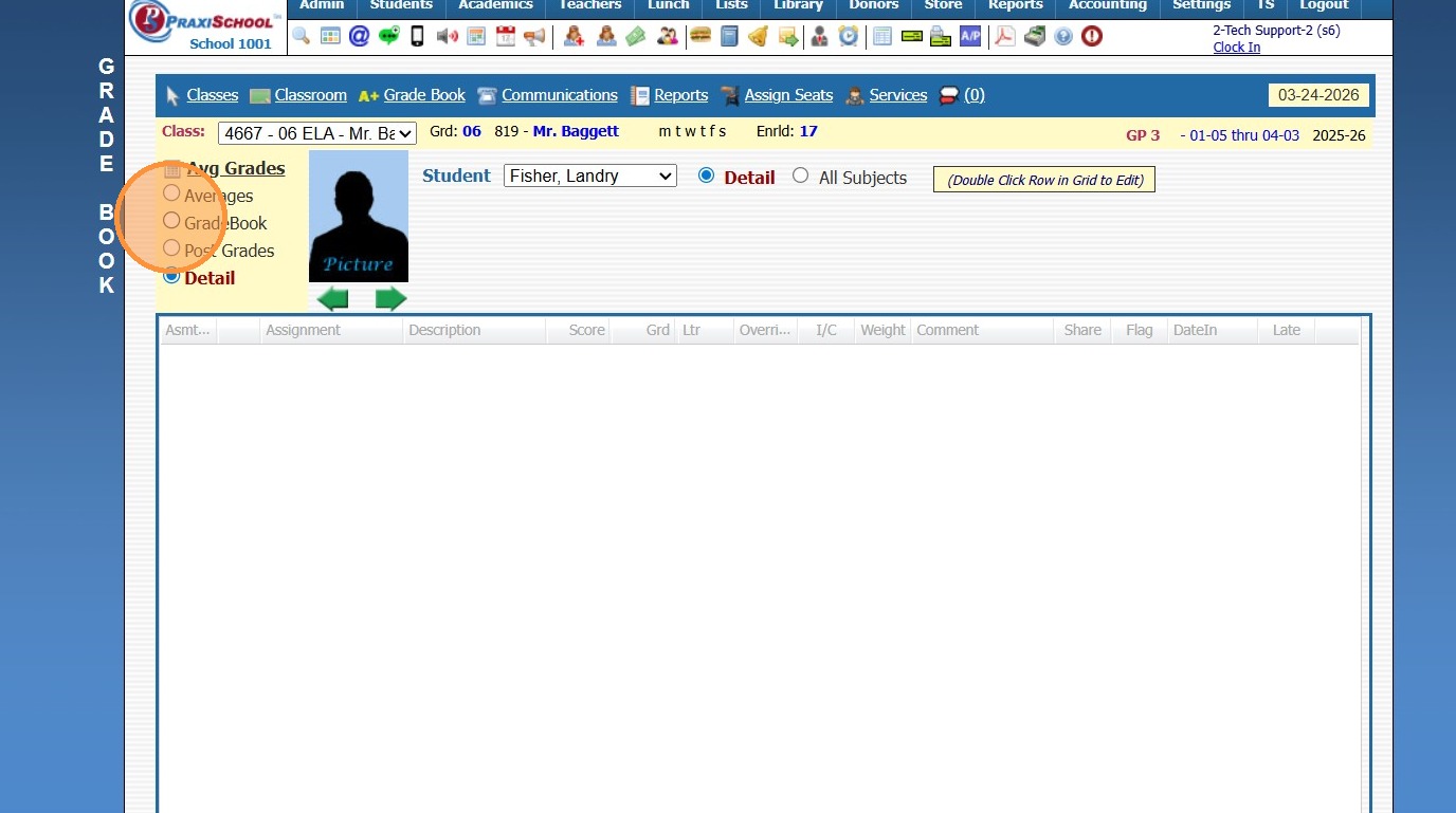 Classroom Detail Grades Report 1. Log into PraxiSchool 2. Click "Teachers" 3. Click "Classroom" 4. Select Class 5. Click "Reports" 6. Click "Detail Grade Book" (Detail Grade Book Report shows All Student's Assignment Grades for Class) 7. Click ...