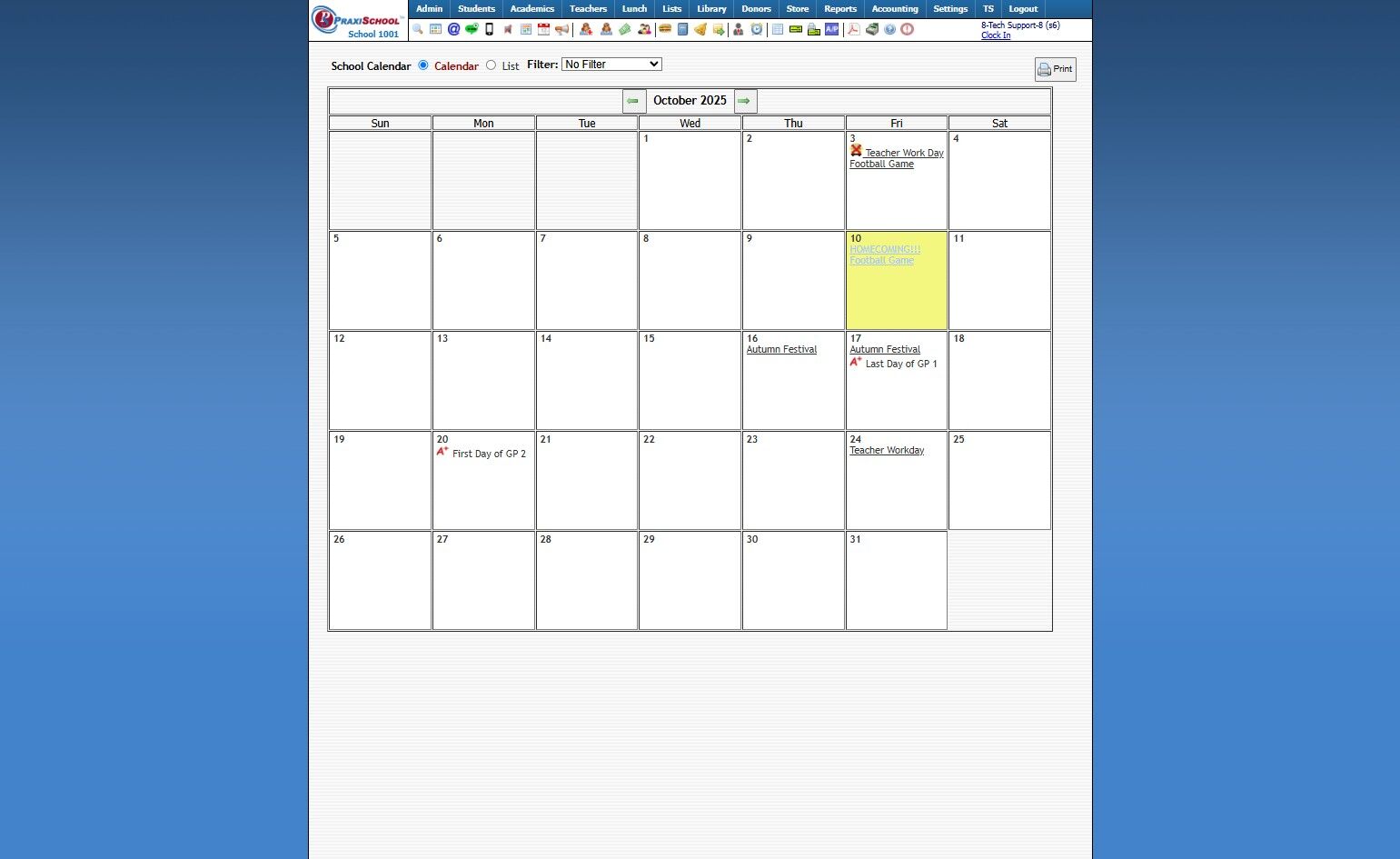 Viewing a Standard Monthly Calendar 1. Login to PraxiSchool 2. Click the 1st Calendar Icon to a Standard Calendar 3. This will populate a Standard Calendar View 7500.1.7
