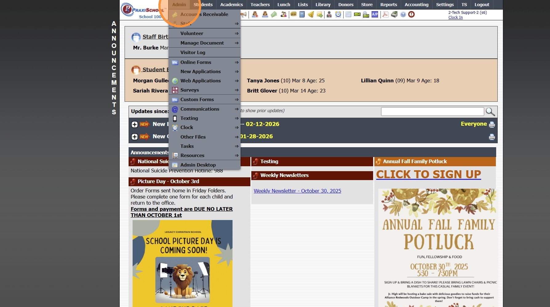 Sending a Schoolwide Email 1. Log into PraxiSchool 2. Click the "@" Icon (@ is the Schoolwide Email icon) 3. Click Staff to Send to All Staff 4. Click A/R to Send to All AR 5. Click All to Send to All Family Files 6. Click Selected to Selected and ...