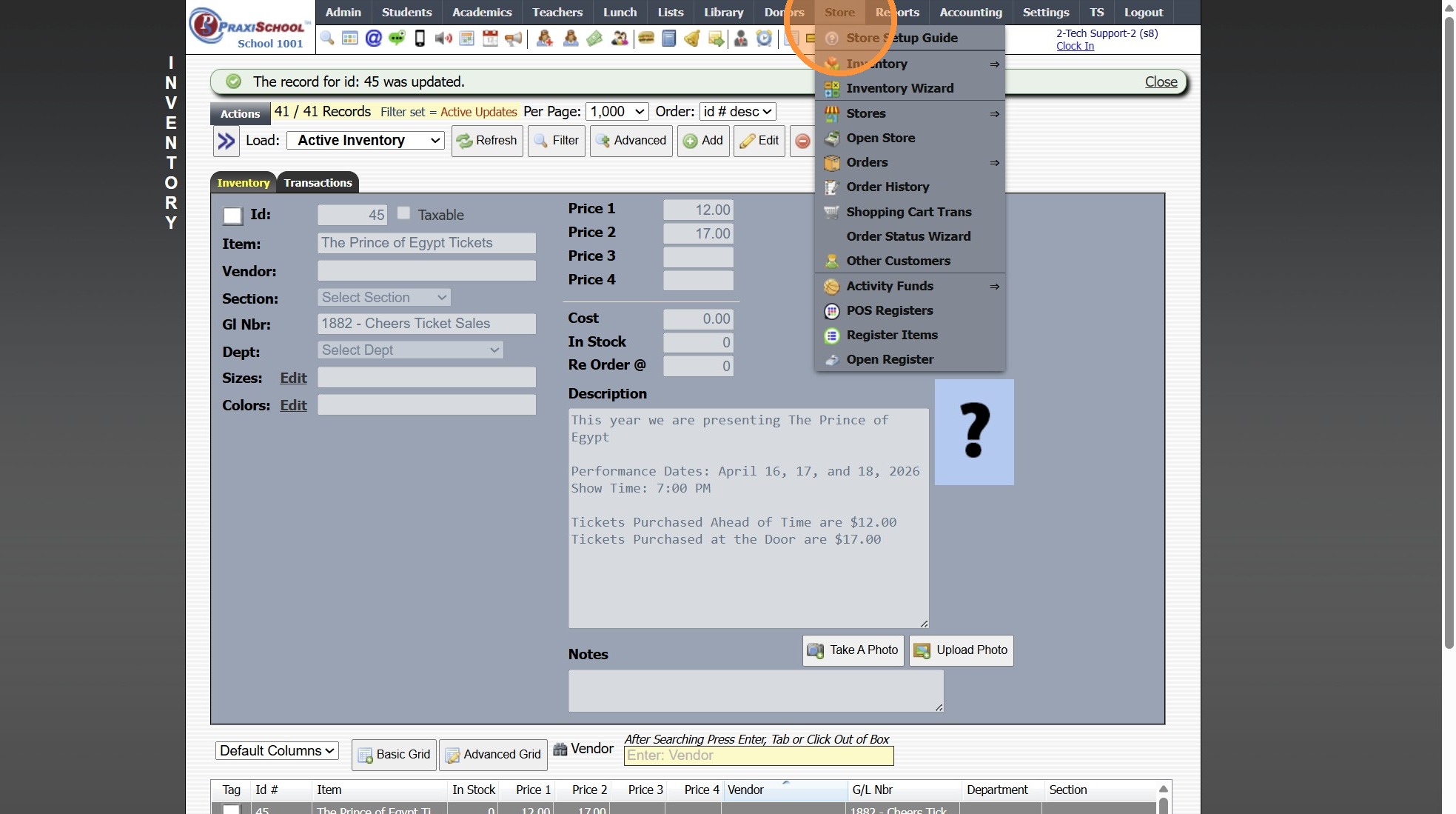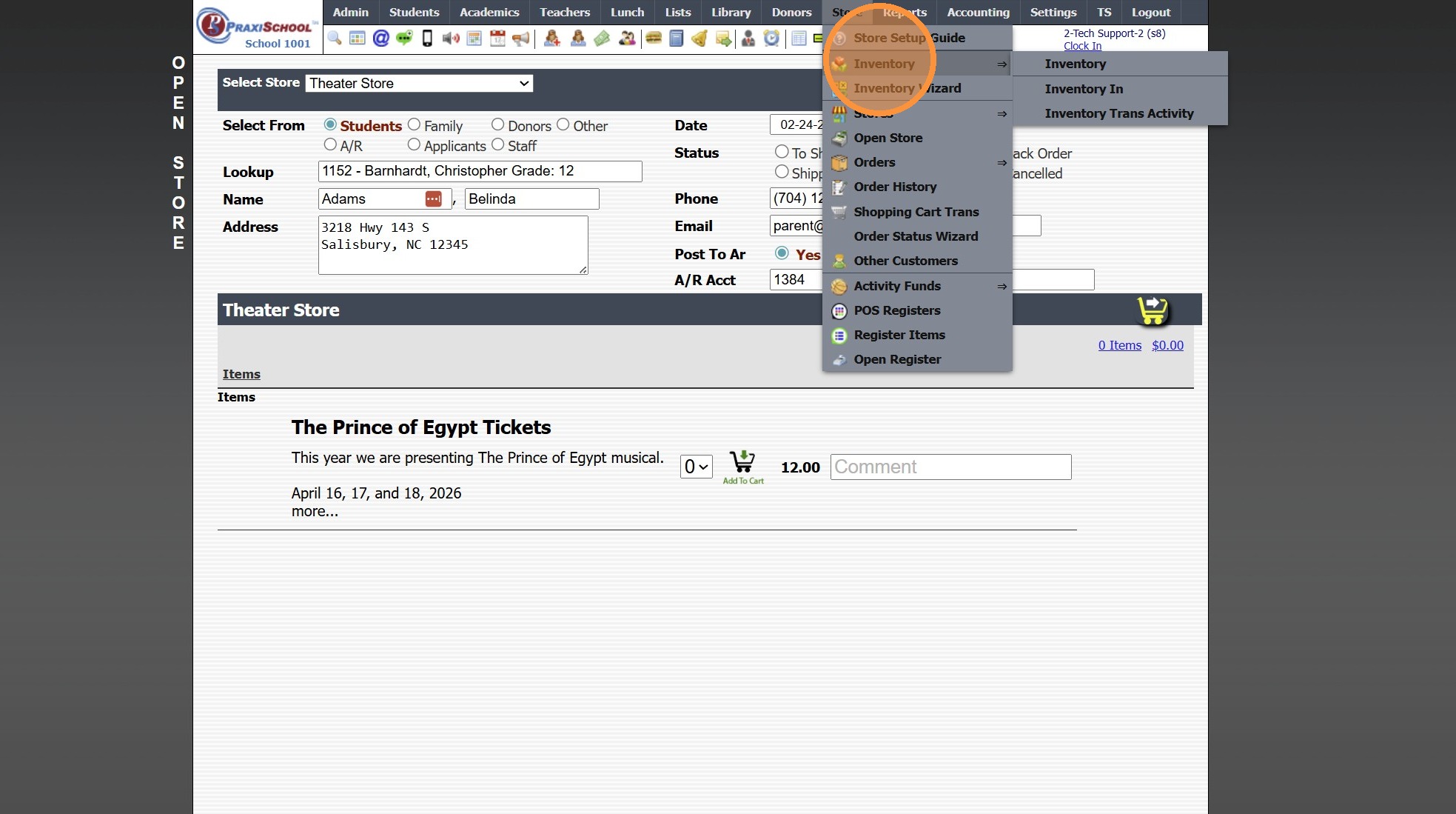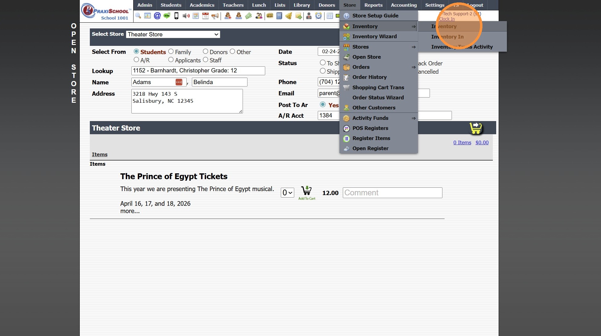 1. Click "Store" 2. Click "Inventory Wizard" 3. Select "Receive" 4. Search Inventory Item 5. Select Vendor (Optional) 6. Enter Quantity Received 7. Enter Cost of Each Item 8. Set Date Received 9. Click "Save" 10. Inventory Transaction Wizard Item ...