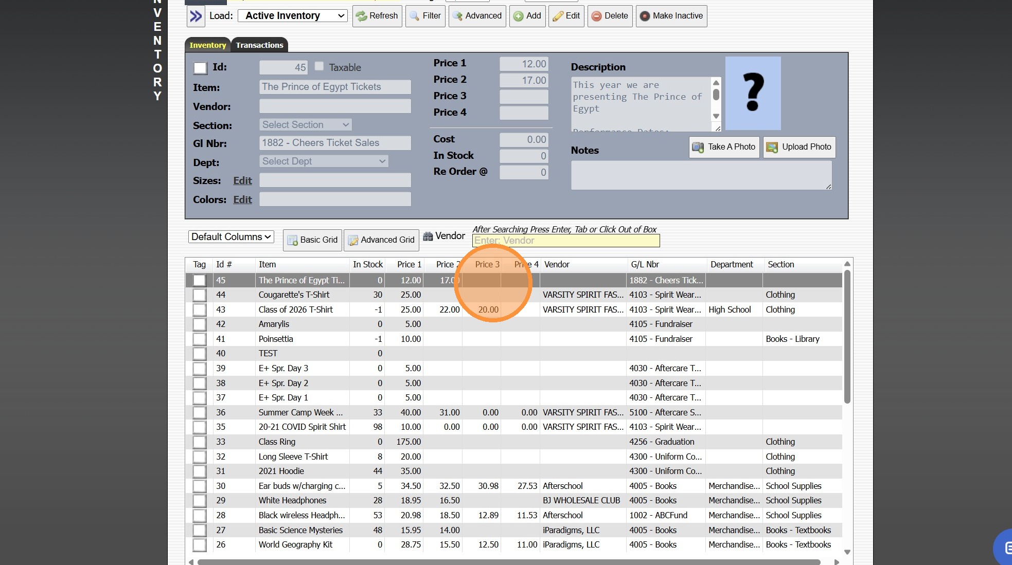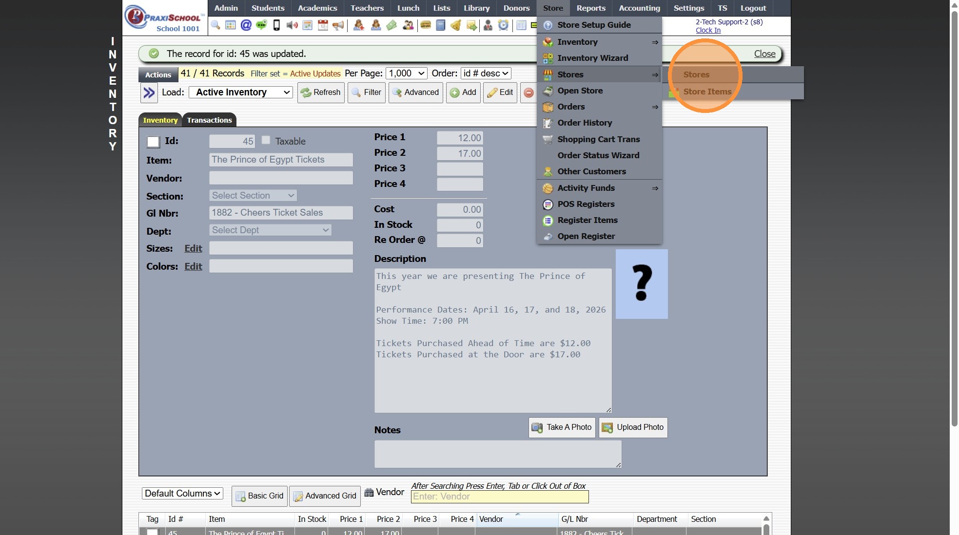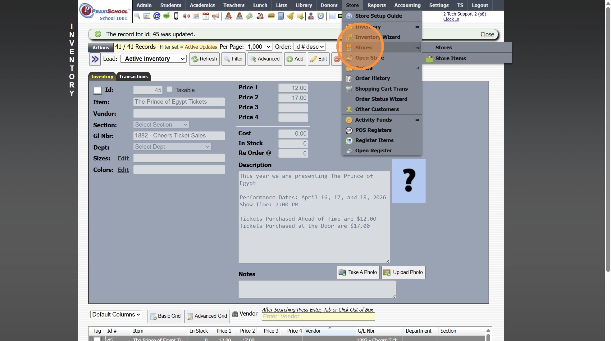 1. Click "Store" 2. Click "Inventory Wizard" 3. Select "Receive" 4. Search Inventory Item 5. Select Vendor (Optional) 6. Enter Quantity Received 7. Enter Cost of Each Item 8. Set Date Received 9. Click "Save" 10. Inventory Transaction Wizard Item ...